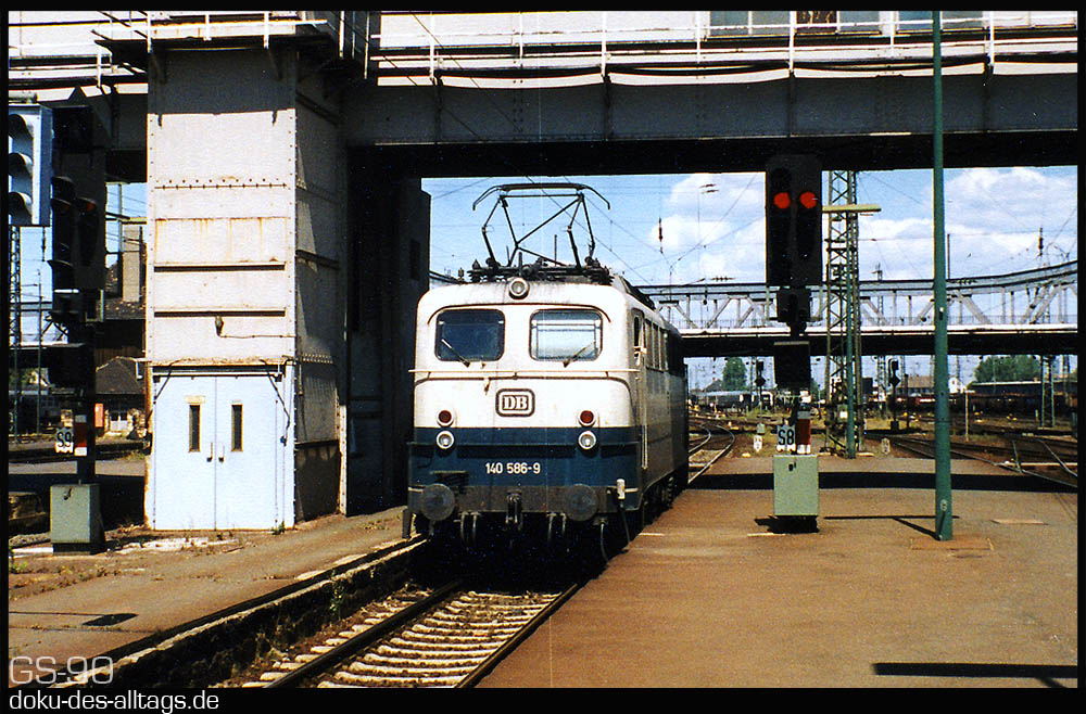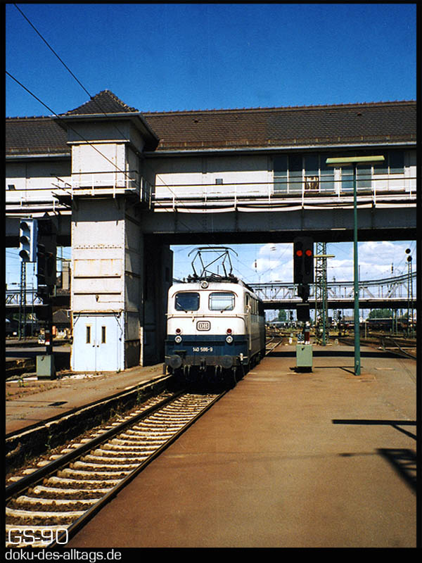 | 4. + 5.) 140 586 (Bw Frankfurt) fährt leer durch Gleis 8 und unterquert die alte Gepäcküberführung. | |||||