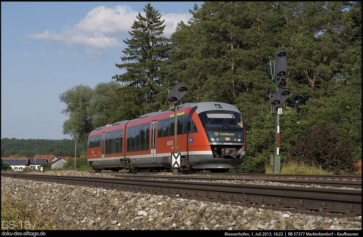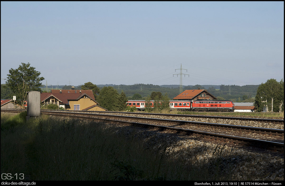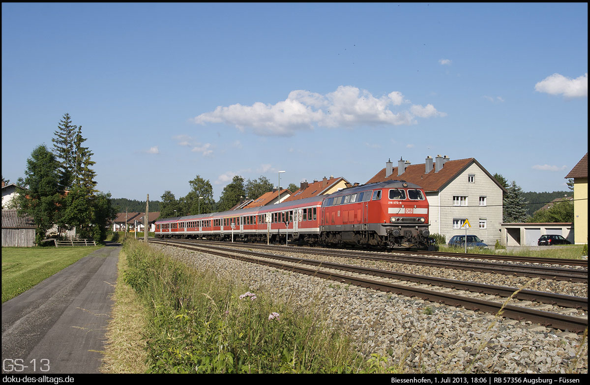 | 2.) Im Sommer 2013 verlässt ein Regionalzug aus Augsburg den Bahnhof Biessenhofen. Das Ziel Füssen wird um 18:56 erreicht sein. Auf dem dreigleisigen Abschnitt rollt 218 472 nun gut 1,5 km nach Südwesten, wo sich kurz vor Ebenhofen die Strecken trennen. | |||