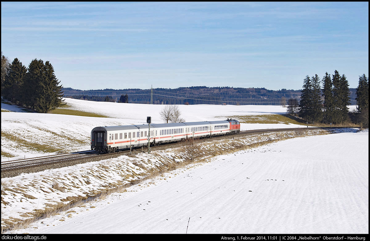 | 32.) Ein winterlicher Blick von der Brücke herunter auf die Kurve. Der IC Nebelhorn ist noch ziemlich am Beginn seiner langen Reise. | ||||||