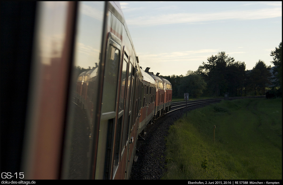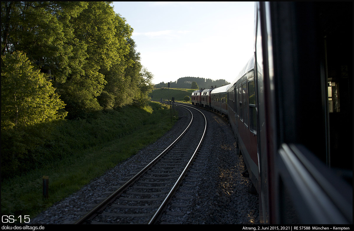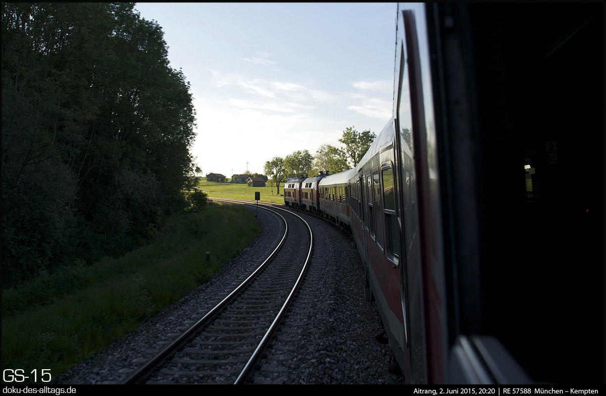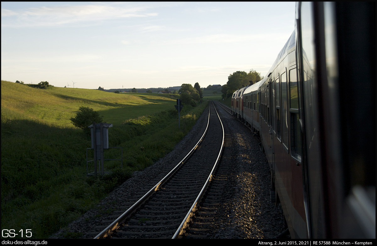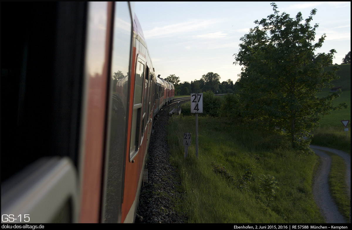 | Die bebilderte Fahrt beginnt hinter Buchloe. Der Zug verließ am 2.6.2015 pünktlich München Hbf. Aufgrund von Bauarbeiten im Bahnhof Fürstenfeldbruck war der Abschnitt Puchheim Fürstenfeldbruck nur eingleisig befahrbar, so dass in Puchheim zwei Gegenzüge abgewartet werden mussten und ein paar Minuten Verspätung zusammenkamen. | ||||||