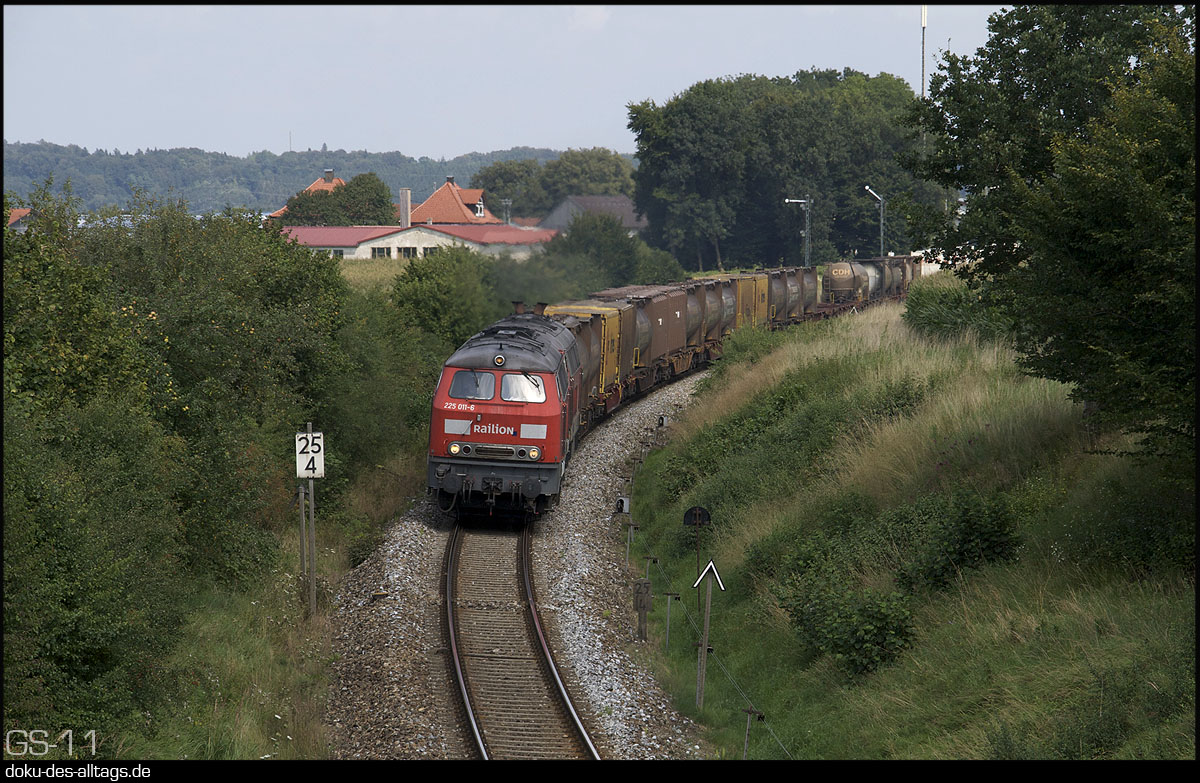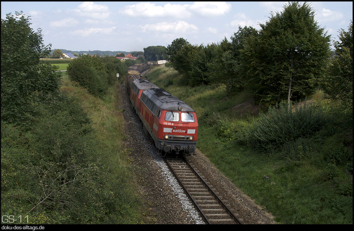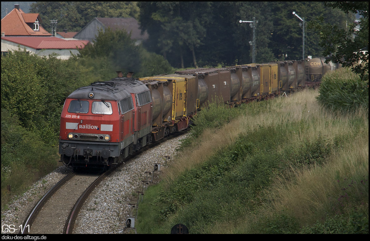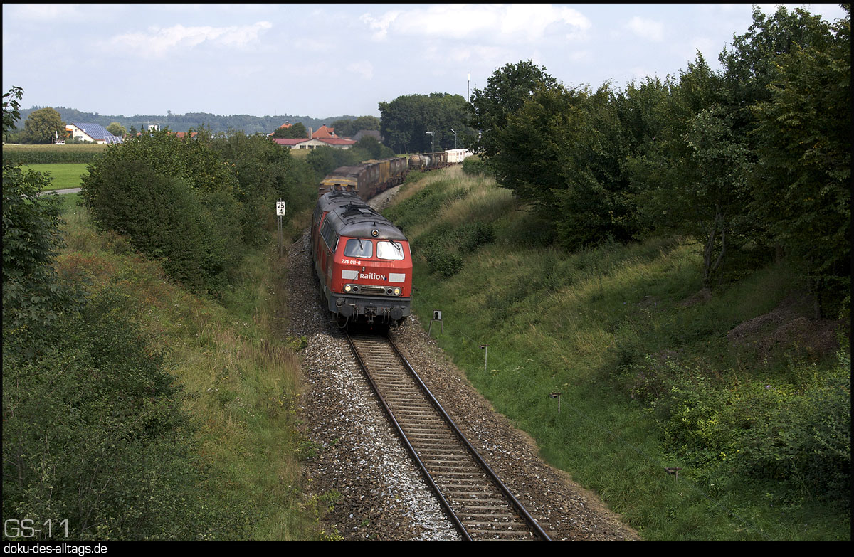 | 2.) Der Regionalbahn folgt ein Güterzug der Arlberg-Umleiterei. Zwei 225er verlassen lautstark den Bahnhof Stetten und legen sich an der Ausfahrt in die Kurve. | ||||