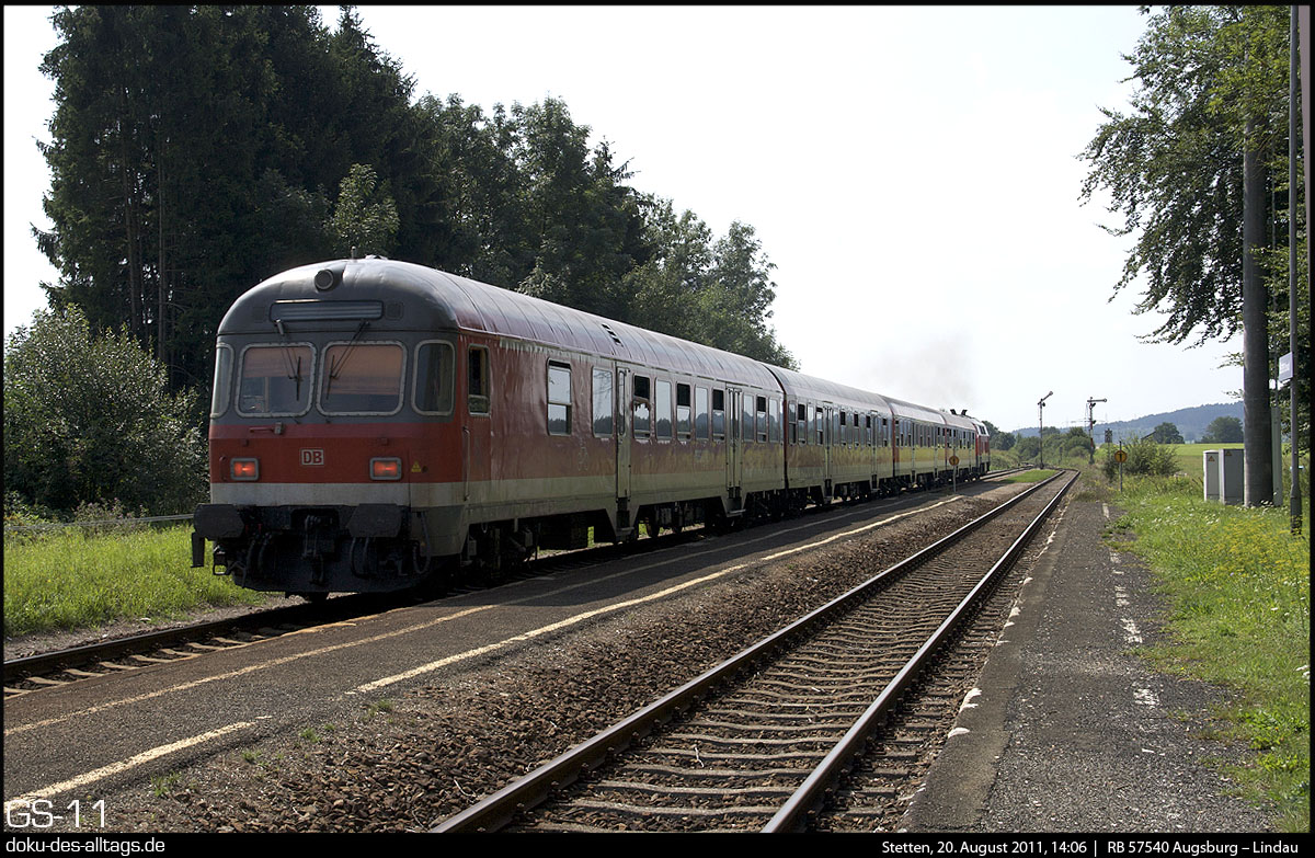| 1.) Der nachmittägliche Nahverkehrszug verließ Augsburg um 13:03 und wird um 16:13 seinen Zielort Lindau erreichen. Nach kurzem Halt rollt der Zug in Stetten weiter und es wird wieder ruhig auf dem in der Sommerhitze liegenden Bahnhof. Zwei Zwischenhalte der RB gestalten sich länger: in Buchloe hat der Zug 8 Minuten Aufenthalt, in Memmingen gleich 24 Minuten. | ||||
