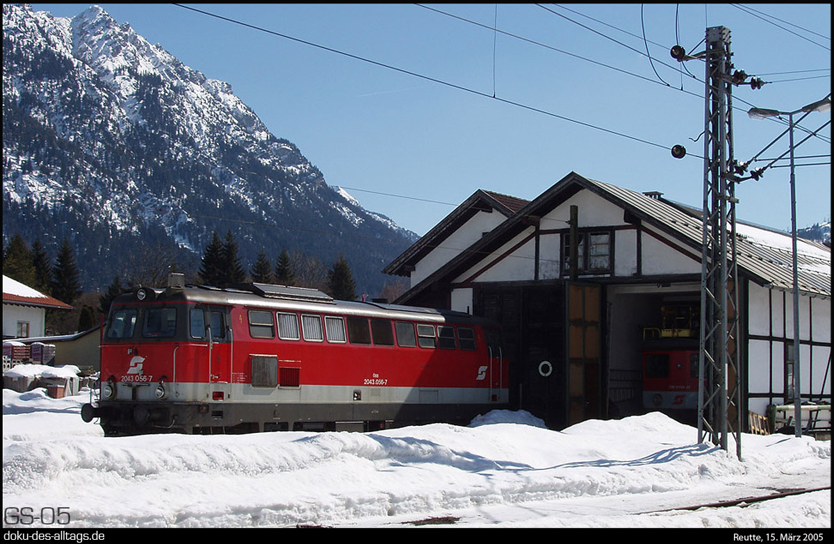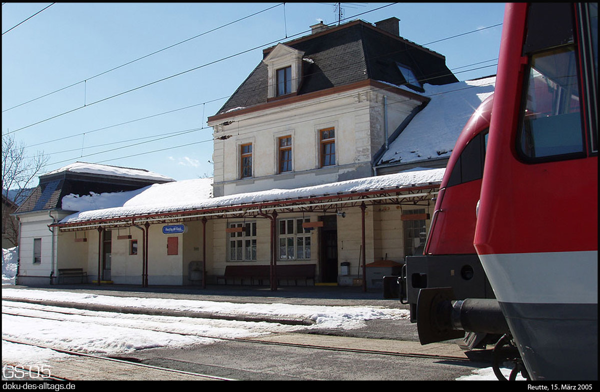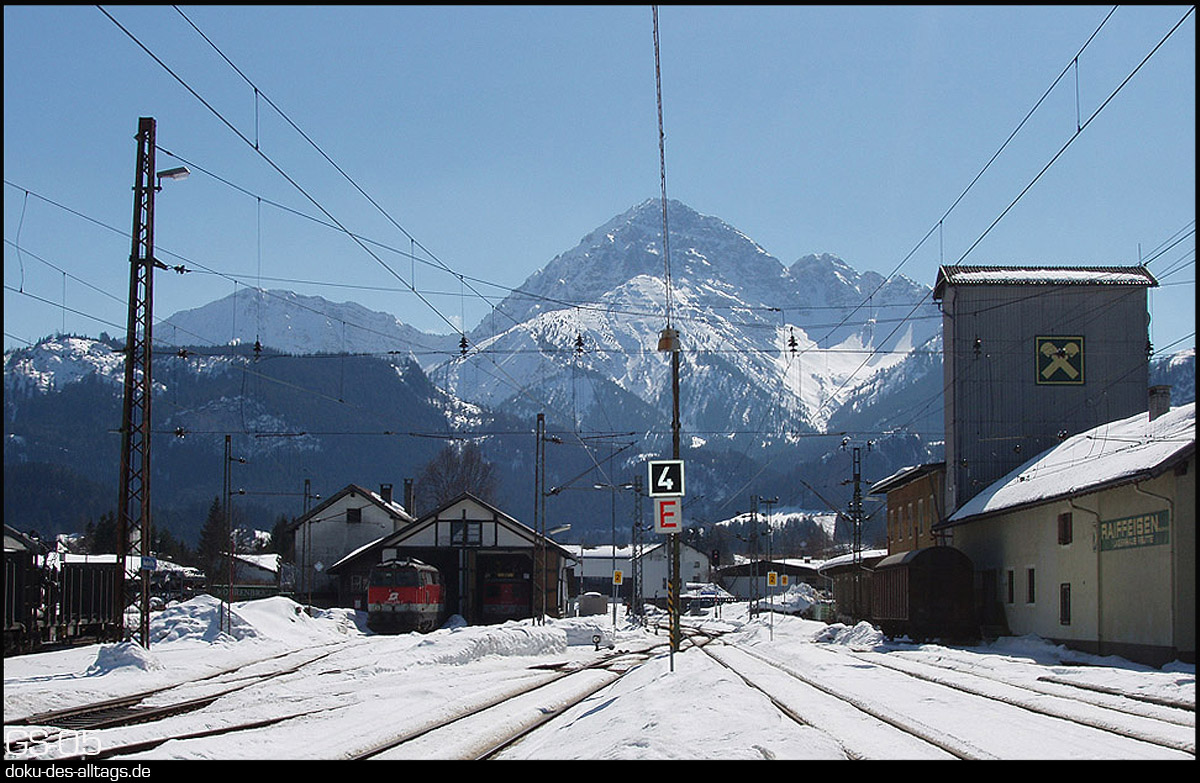 | 1.) Bahnhof Reutte am 15. März 2005, Ausfahrt Richtung Garmisch, flankiert vom zweiständigen Lokschuppen und dem Raiffeisen-Lagerhaus.