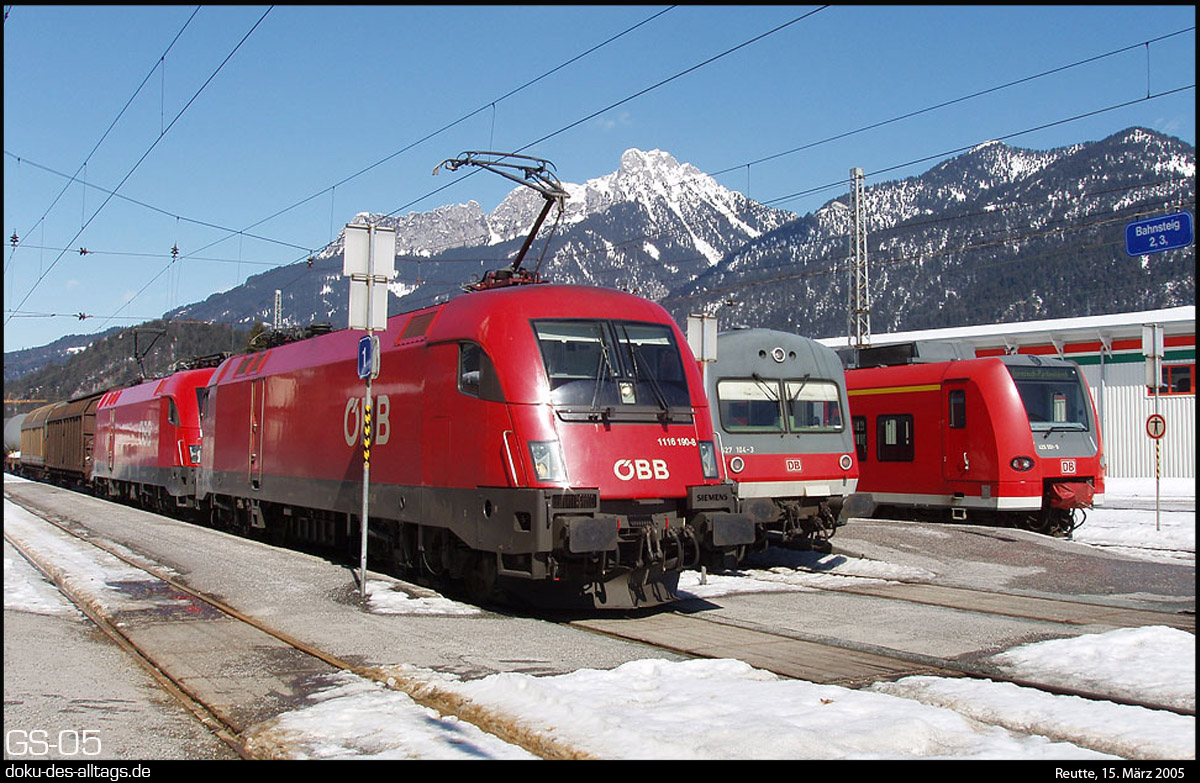 | 3.) Zu dem Zeitpunkt ebenfalls schon eingesetzt sind die damals noch sehr neuen Elloks der Reihe 1116, hier sogar mit Doppeltraktion. Nebendran steht 627 104, der in Kürze nach Kempten fährt, sowie ein 425, der soeben aus Garmisch angekommen ist. | ||||||||