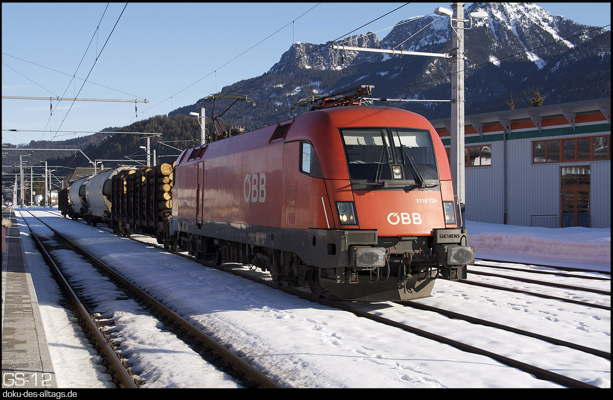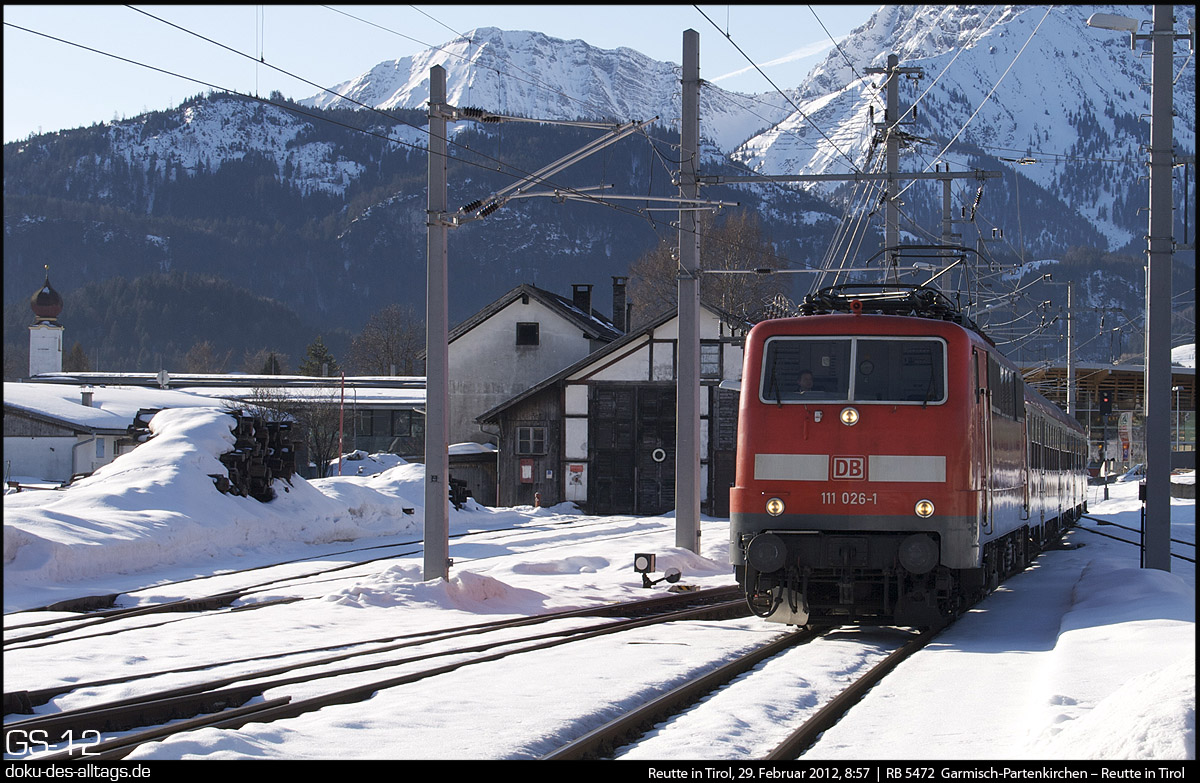 | 7.) Wegen der winterlichen Witterungsverhältnissen fährt zwischen Garmisch und Reutte ein lokbespannter Zug anstatt der leichten Elektrotriebzüge. 111 026 bei der Einfahrt in Reutte. Neue Betonmasten für die Oberleitung haben die Perspektive verändert. | ||||||||