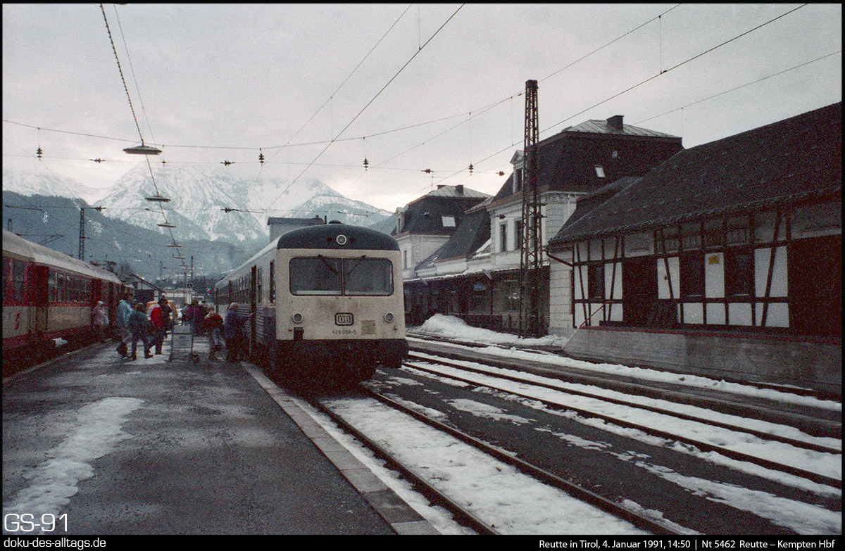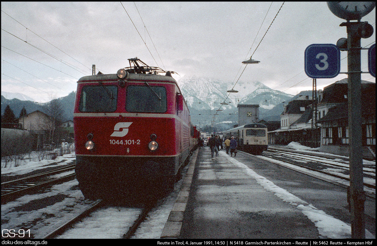 | 8.) Weiter zurück in der Zeit: am wolkenverhangenen 4. Januar 1991 hat 1044 101 ihren Nahverkehrszug von Garmisch gebracht. | ||||||||