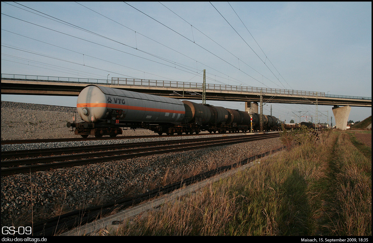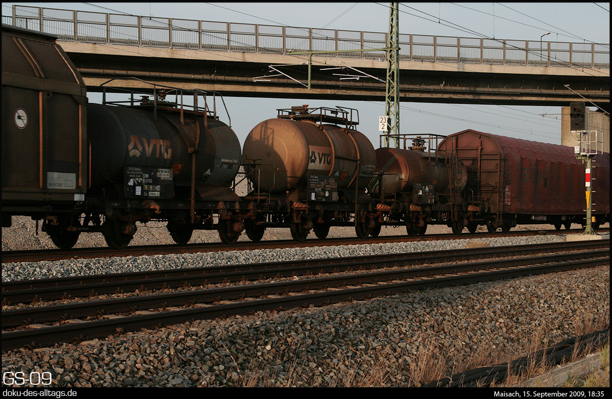 | 4.) In dem Zug ist eine illustre Anzahl von zweiachsigen Kesselwagen eingereiht. | |||||||||||||||||