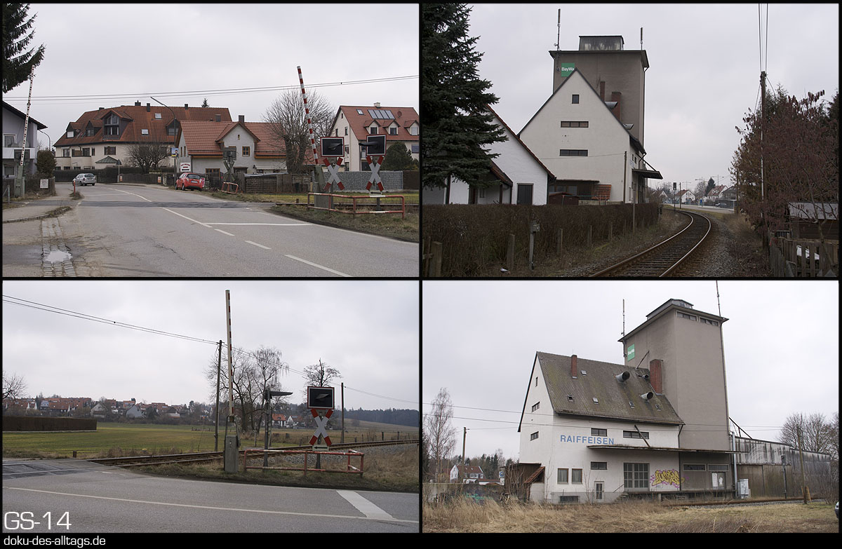 | 7.) Der Bahnübergang und das kombinierte BayWa/Raiffeisen-Lagerhaus aus zwei Bauepochen. | |||||