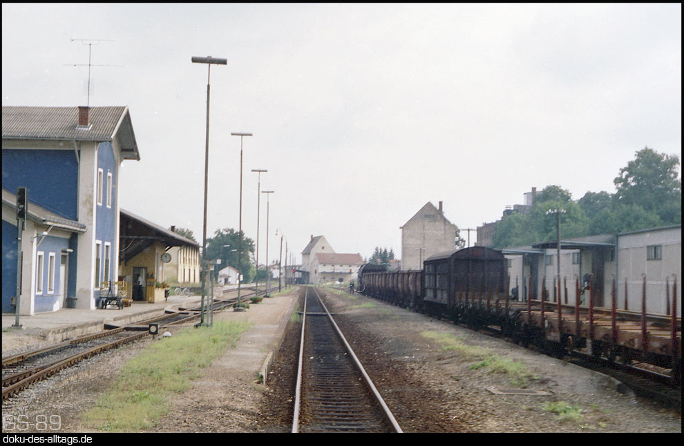 12.) Der Bahnhof Geiselhöring. Seine einstige Bedeutung lässt sich hier noch ausmachen. Es ist der größte Bahnhof der Strecke, der 1989 noch immer mit zahlreichen Gleisanschlüssen versehen war. Auf Gleis 3 wartet ein stattlicher Güterzug die Überholung durch den Schienenbus ab. Die Hochbordwagen kündigen schon die bevorstehende Rübenkampagne an.