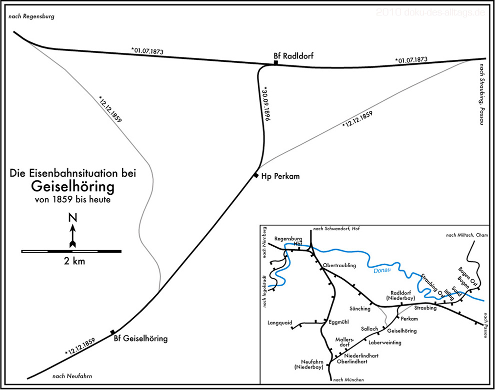 12a.) Eine Karte zur Veranschaulichung der diversen Streckenänderungen. Seit Fertigstellung der Bahn Straubing Passau im Jahre 1860 mußten die Züge zwischen Passau und Regensburg in Geiselhöring Kopf machen. Um dieses Hindernis aus dem Weg zu schaffen wurde am 1. Juli 1873 die Verbindung Straubing Radldorf Sünching geschaffen.