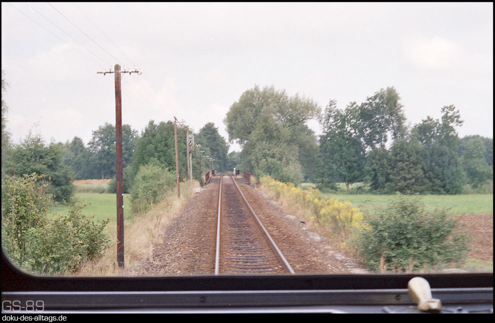 23.) Bis zum Hp Perkam verläuft die Strecke nach Nordost und biegt dann scharf nach nordwest ab. Dort wird die sich gemütlich dahinschlängelnde Kleine Laber überquert. Dahinter kündigt eine Bake schon das Einfahrtsignal von Radldorf an, wo die Hauptstrecke erreicht wird. | |||||||||