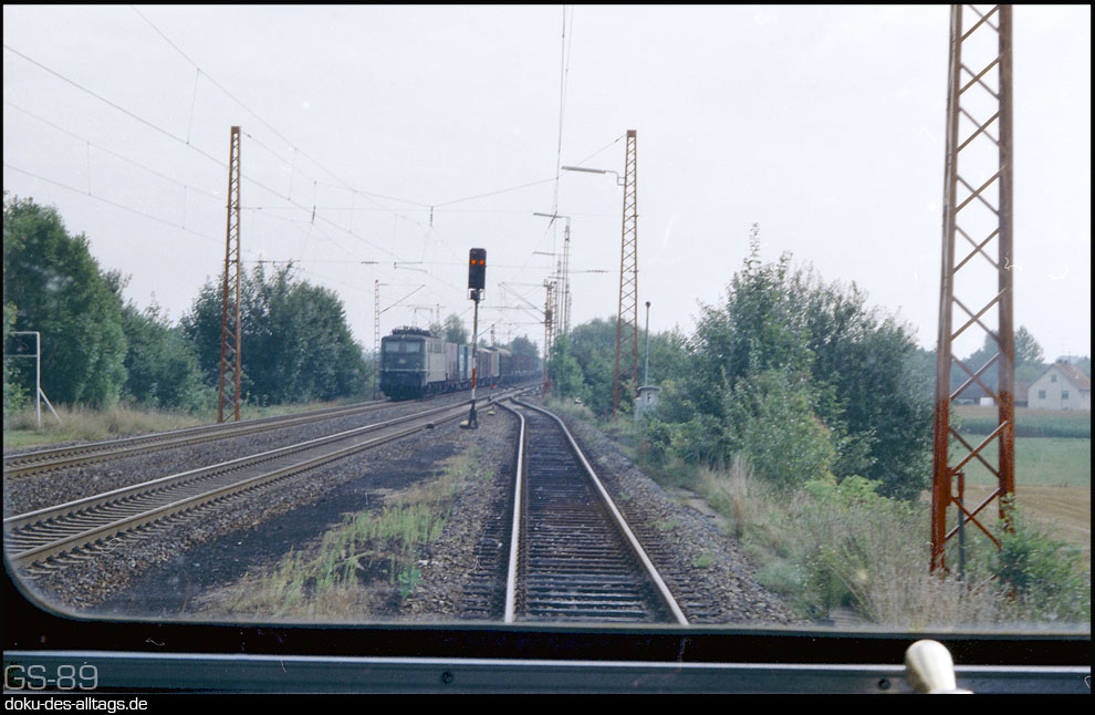 Hier knattert der Nto 5316 um 11:10 aus Gleis 3 und begegnet einer 150, die einen Güterzug von Passau nach Regensburg befördert. Nach Straubing ist es nun nicht mehr weit. 10 Kilometer, die der Schienenbus in 9 Minuten bewältigt haben wird. |