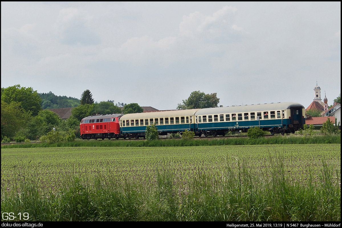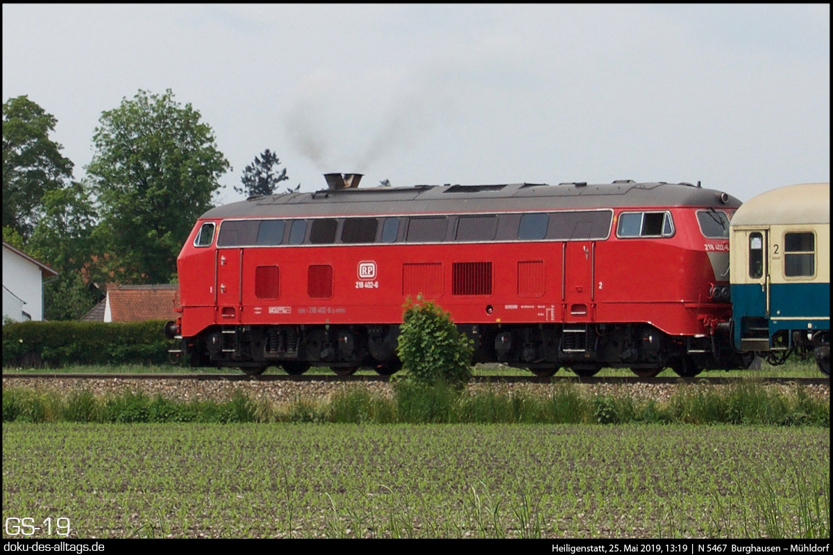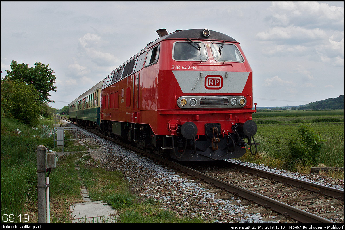 | 1.) Zurück an die Burghausener Strecke. Die orientrote 218 402 bei der Einfahrt in Heiligenstatt. Abfahrt in Burghausen war um 12:50, Ankunft in Mühldorf um 13:30.