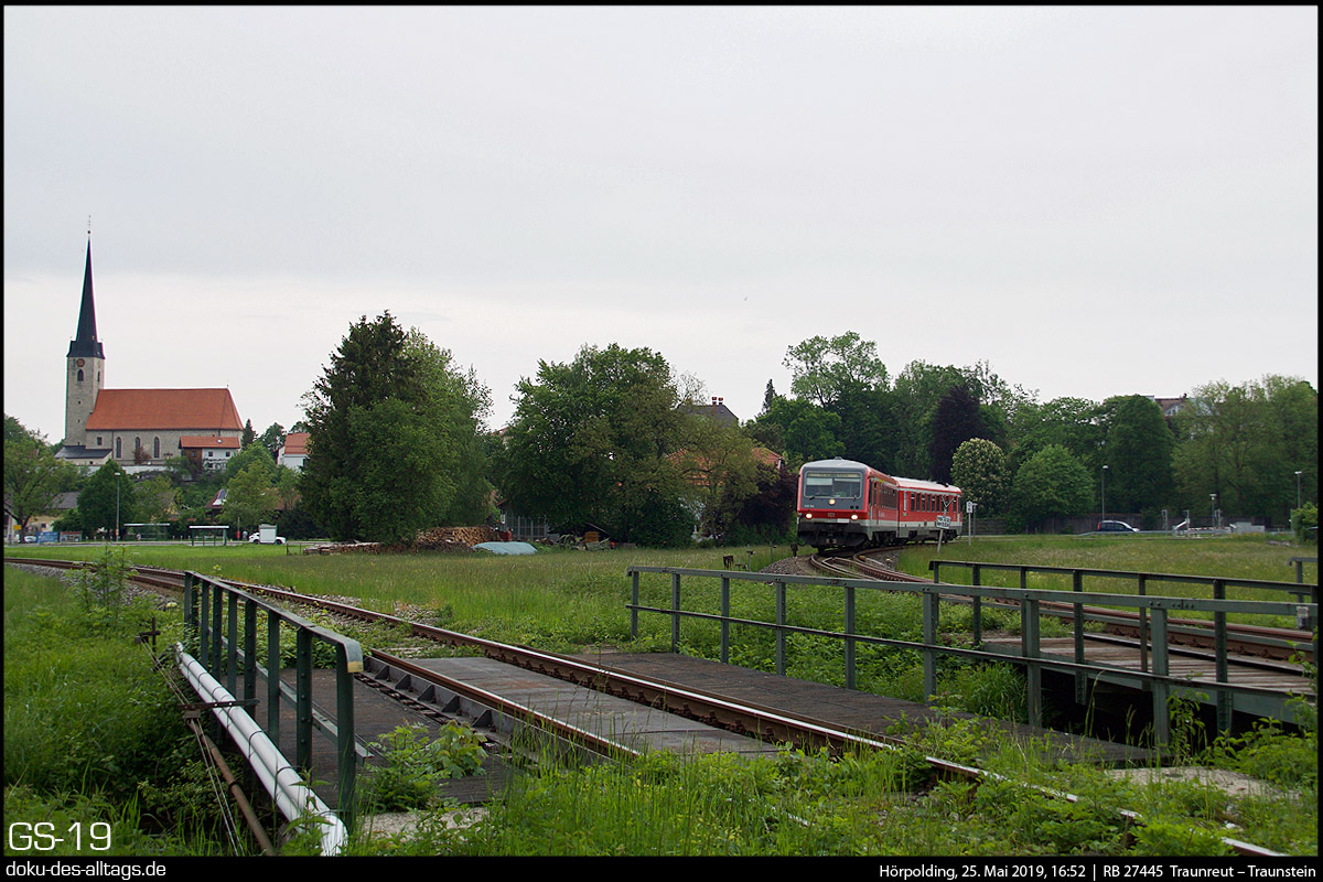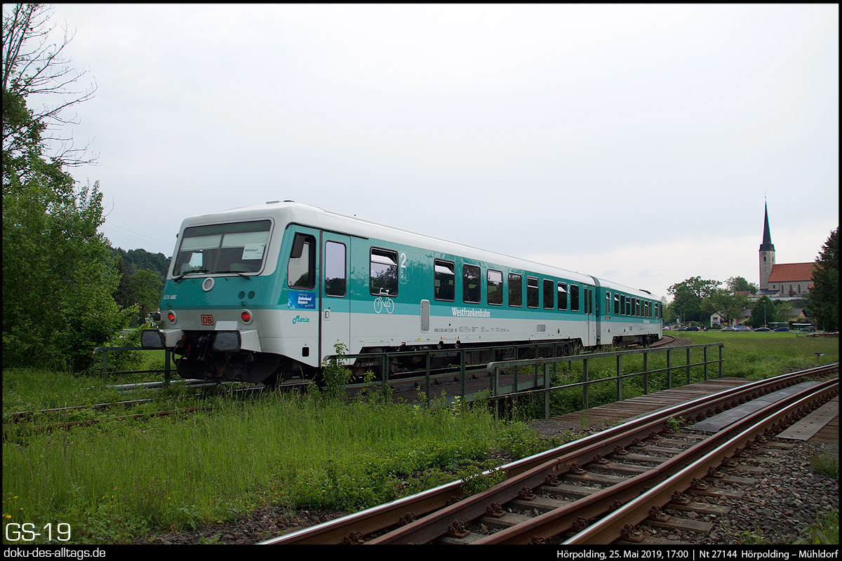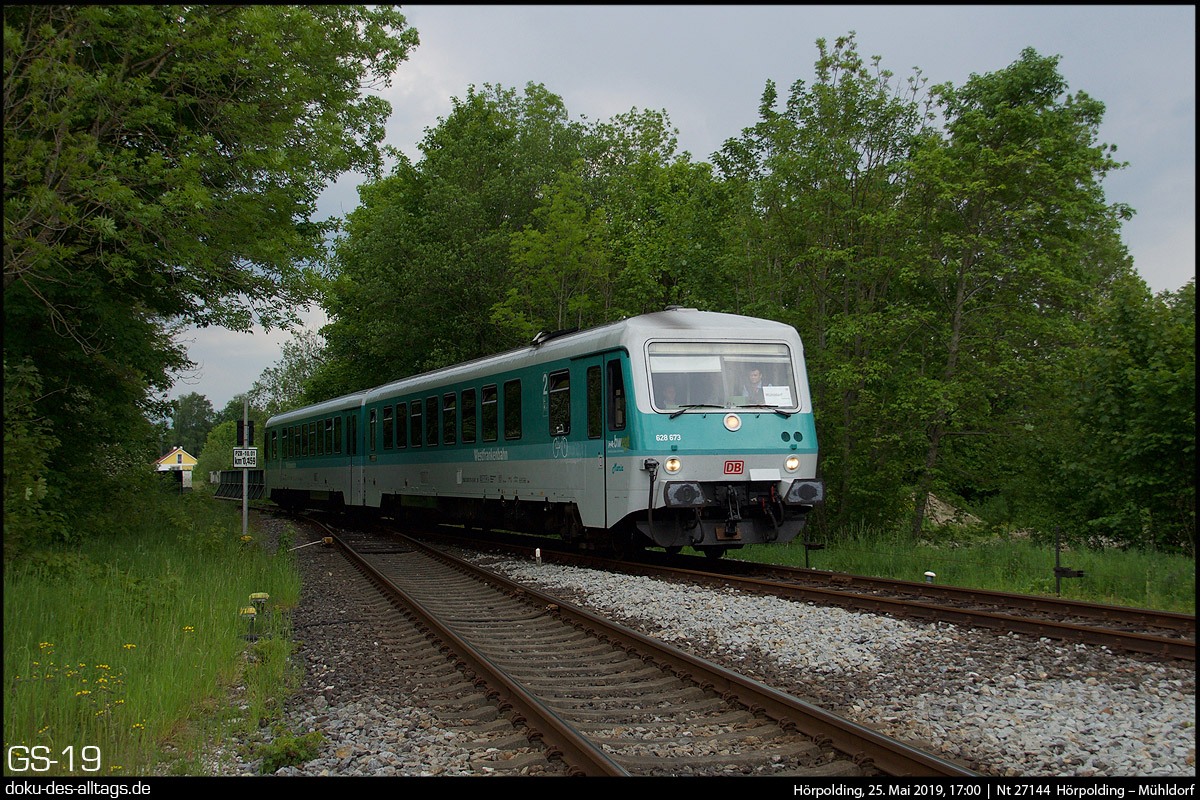 | 20.) Entgegen kommt nun Maria, der mintgrüne Doppel-628 der Westfrankenbahn, bestehend aus 628 486 und 628 673. Das Wetter hat inzwischen umgeschlagen. Der Triebwagen wird diesmal bis Hörpolding fahren. | |||||