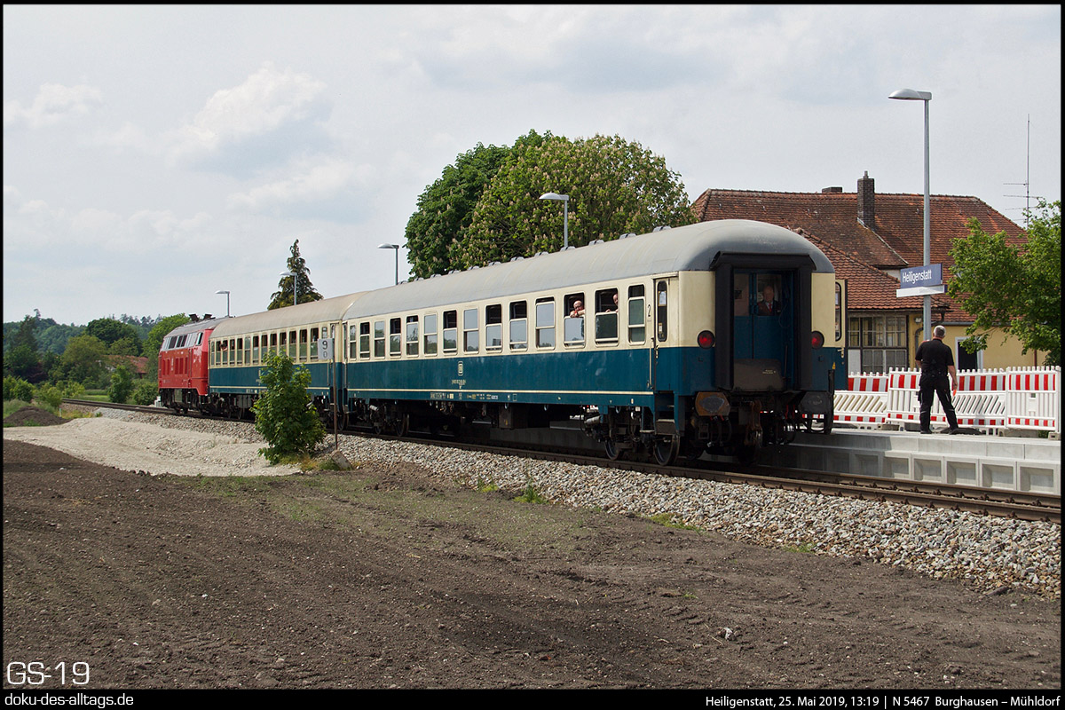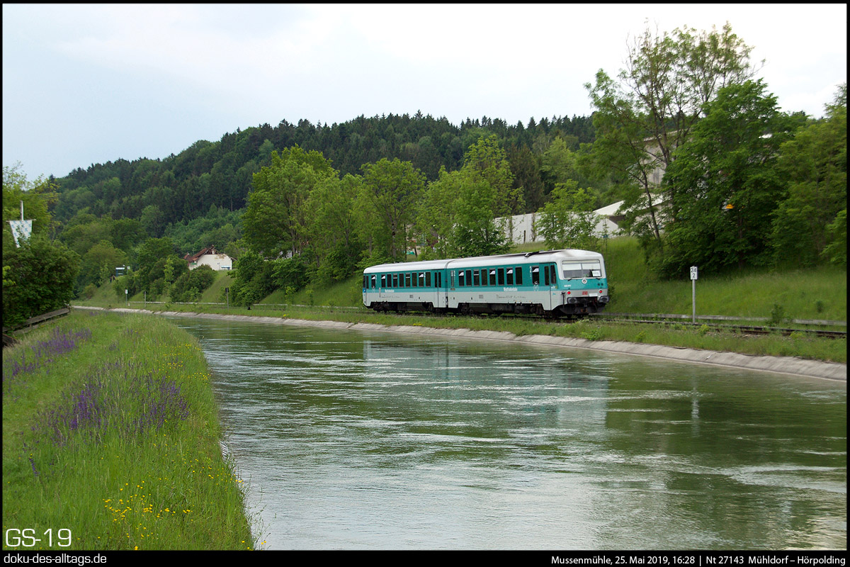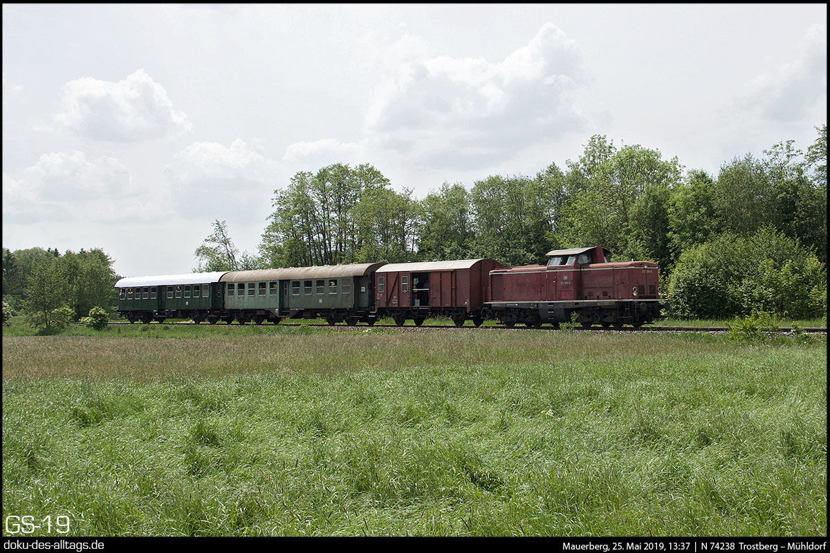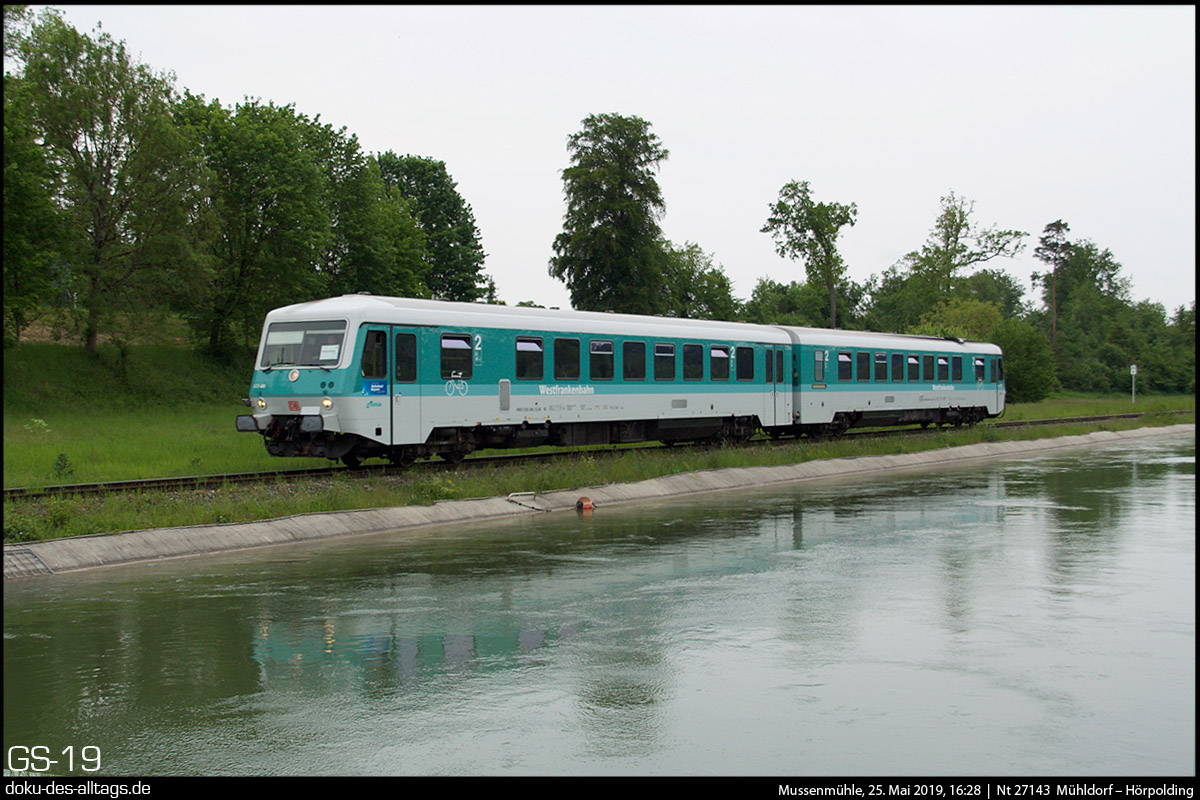 | 20.) Entgegen kommt nun Maria, der mintgrüne Doppel-628 der Westfrankenbahn, bestehend aus 628 486 und 628 673. Das Wetter hat inzwischen umgeschlagen. Der Triebwagen wird diesmal bis Hörpolding fahren. | |||||