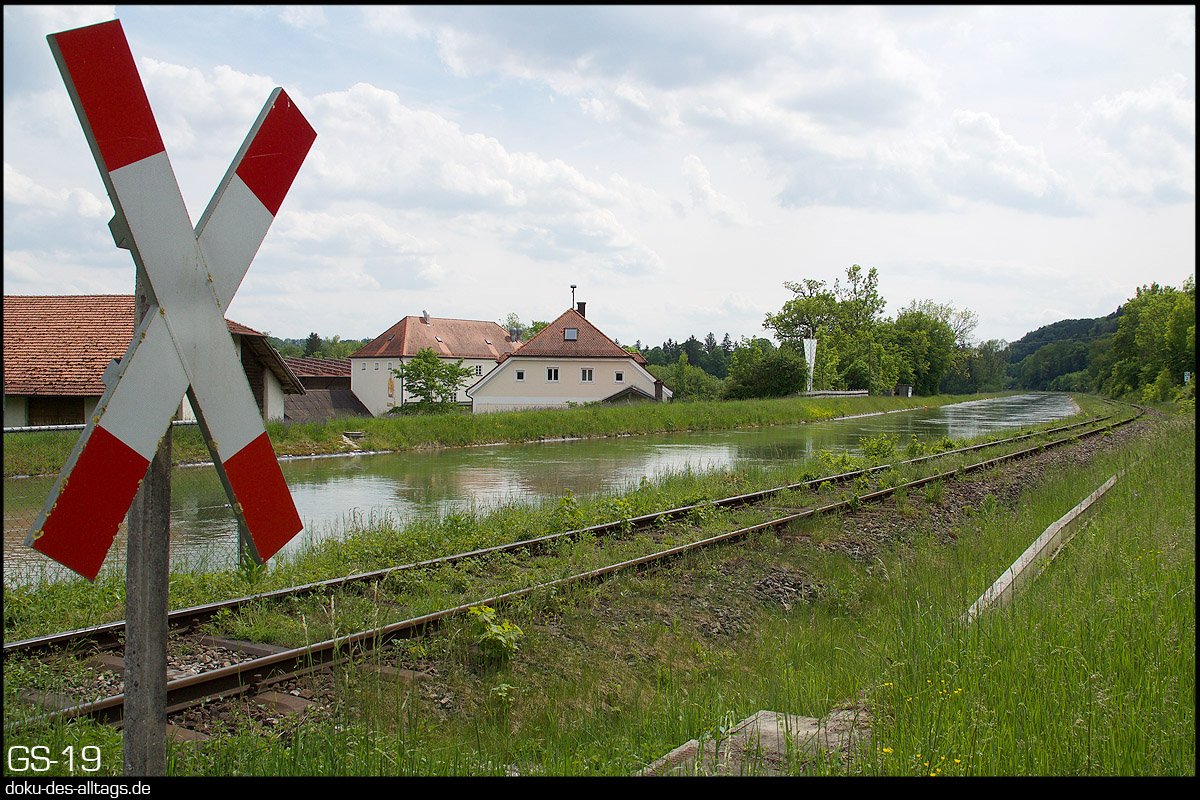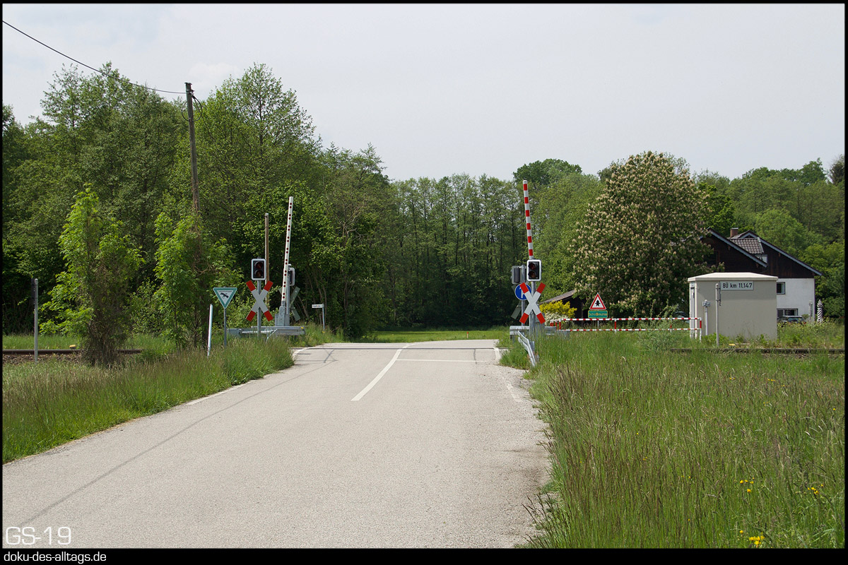| 8.) Wir befinden uns nun wieder auf dem Streckenabschnitt Tüßling Garching, hier beim BÜ Schloßmühle beim km 11,15. Genau hier, rechts vom Bahnübergang befand sich einst der Haltepunkt Mauerberg, der Anfang der 80er Jahre aufgelassen wurde. | |||||