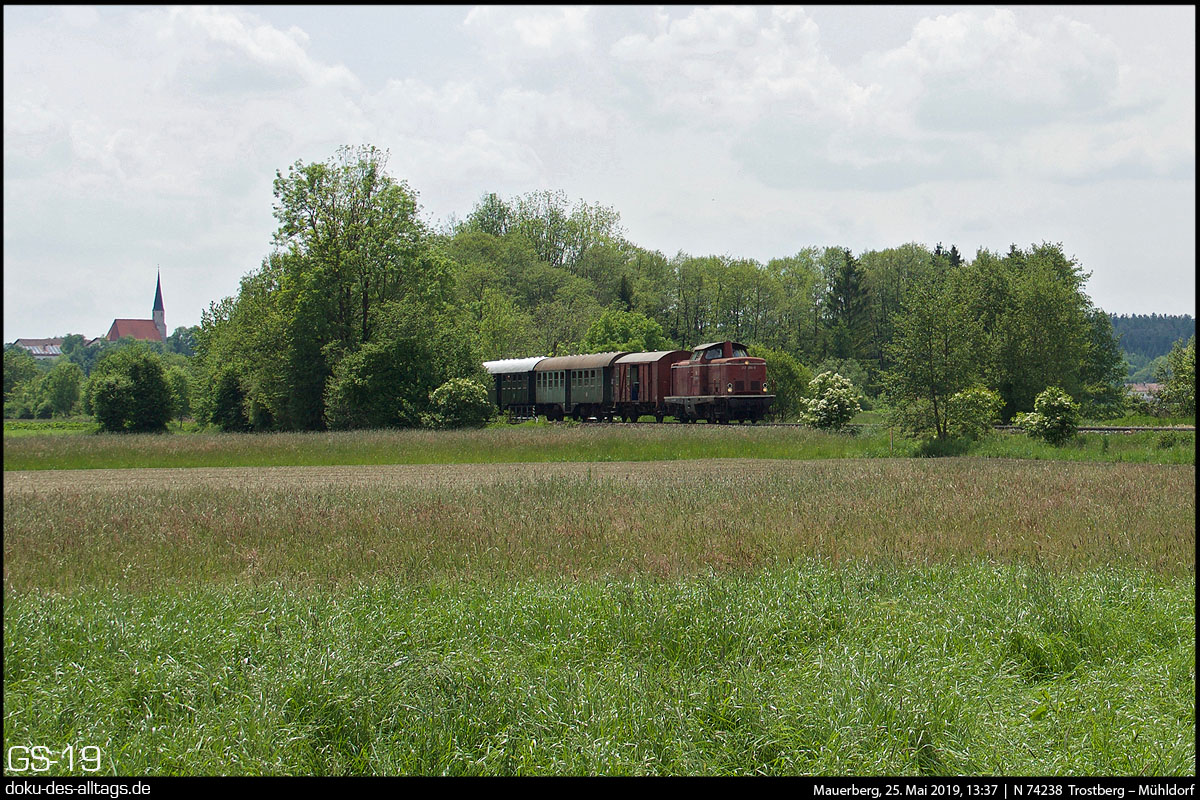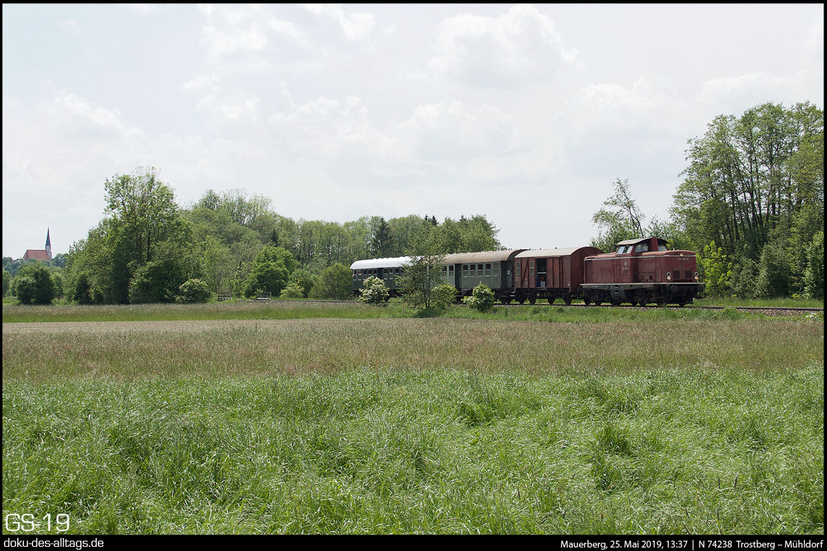 | 10. 12.) Die Ortschaft Mauerberg befindet sich ein gutes Stück vom (früheren) Hp entfernt, im Hintergrund ist der Kirchturm von Mauerberg. Hier nähert sich nun 212 084 von Trostberg kommend. Nach der Ankunft in Mühldorf um 13:50 wird der Zug um 14:37 ein weiteres und letztes Mal den Weg nach Burghausen einschlagen, Ankunft dort um 15:15. | |||||
