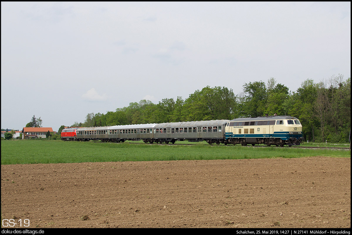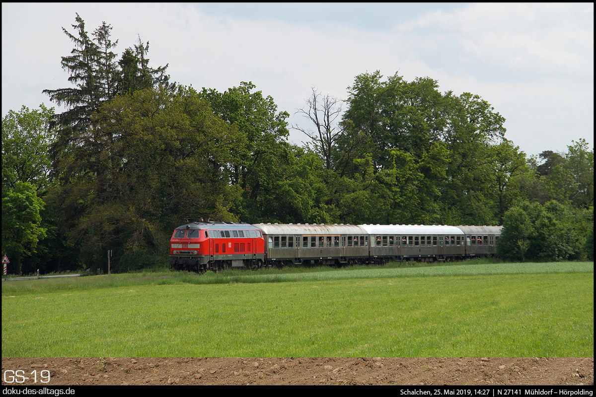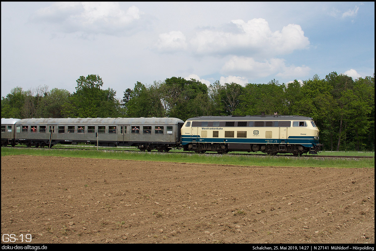 | 13.) Der nächste Zug auf der Traun-Alz-Bahn geht nun über Trostberg hinaus, bis nach Hörpolding. Hier haben wir wieder die Silberling-Garnitur mit 218 460 und 218 430 zwischen Tacherting und Schalchen. | |||||