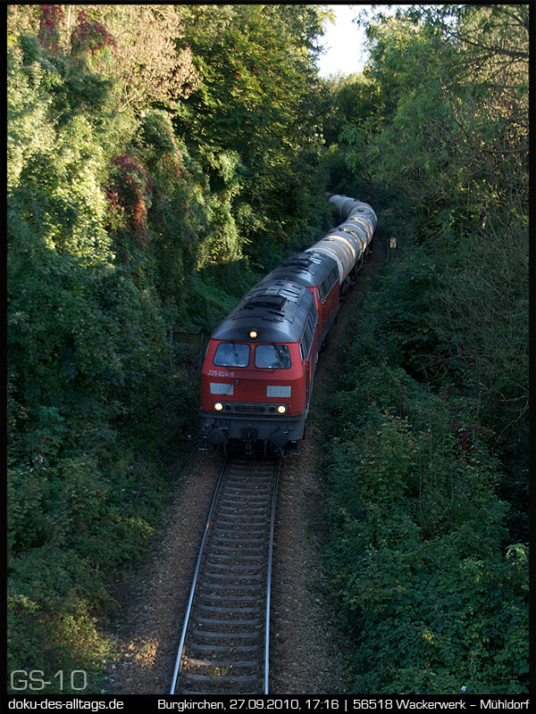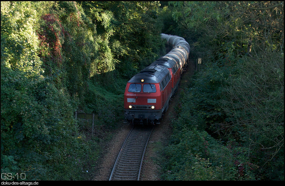 3. + 4. Aus der Gegenrichtung schlängelt sich ein Kesselwagenzug herab, mit der an diesem Tag schon zum dritten Mal gesichteten 225 024. | |||||||||