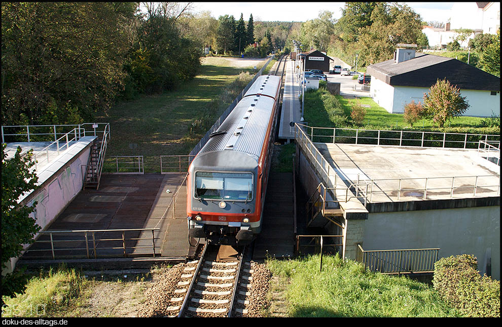 1.) 628 628 verlässt Burgkirchen auf dem Weg nach Burghausen. Burgkirchen hatte früher ein zweites Gleis, das unmittelbar vor der Gewässerkreuzung abzweigte. | ||||||||||