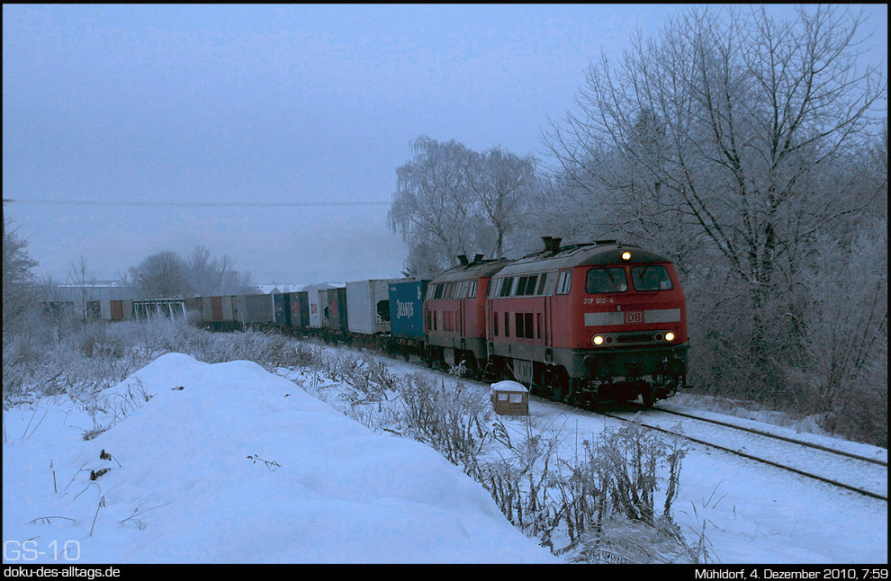 | 6.) Nun wird es schlagartig winterlich. Von Landshut kommend befördern 217 012 und 218 005 das Wackershuttle nach Mühldorf. Dort wird Kopf gemacht und es geht weiter nach Burghausen. In der linken Bildhälfte sieht man die Gitterkonstruktion der westlicheren Brücke. | ||||||