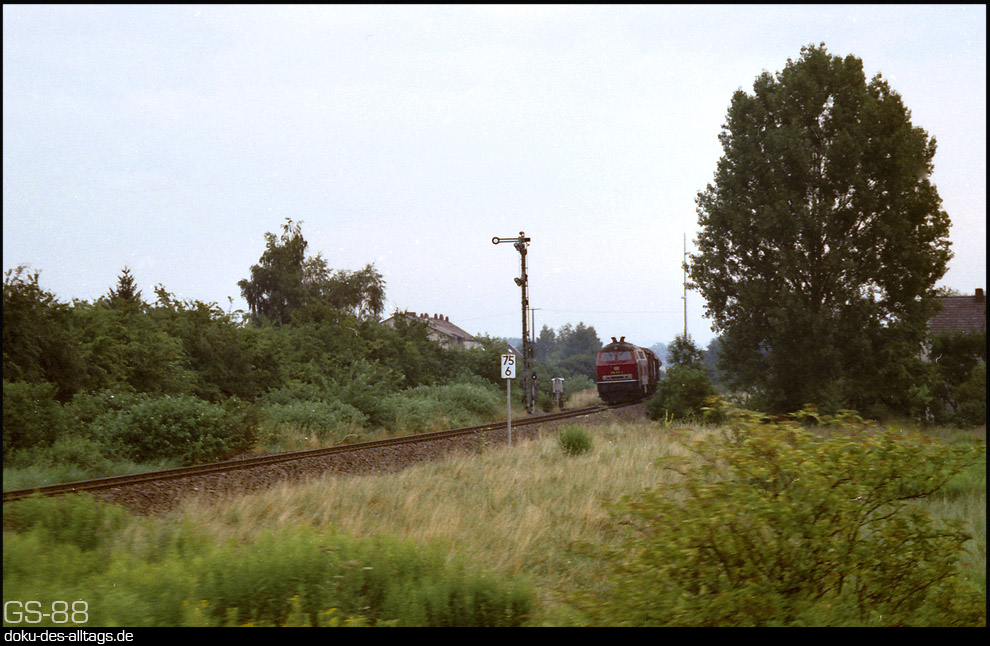 | 9.) Im Sommer 1988 wartet 218 344 mit einem Nahgüterzug aus Simbach am Einfahrtsignal von Mühldorf. Gesehen aus dem Zugfenster des ausfahrenden E 3435 München Burghausen. Der Fußgängerübergang von Bild 5 liegt etwa in 300 m in Blickrichtung. | ||||||