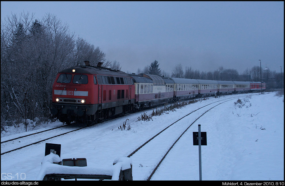 | 7.) Aus der Gegenrichtung kommt wenig später 218 360 mit einem Sonderzug von Rosenheim nach Nürnberg. | ||||||