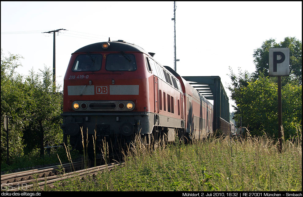| 3.) 218 419 ist nach Simbach unterwegs und überquert auf der südöstlichen Brücke den Innkanal. Da unmittelbar hinter der Brücke, die auch seitlich von Fußgängern überquert werden kann, ein Bahnübergang für Fußgänger ist, steht hier eine Pfeiftafel. | ||||||