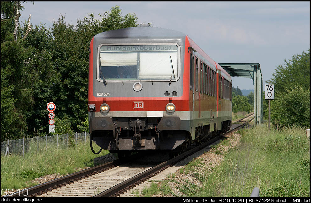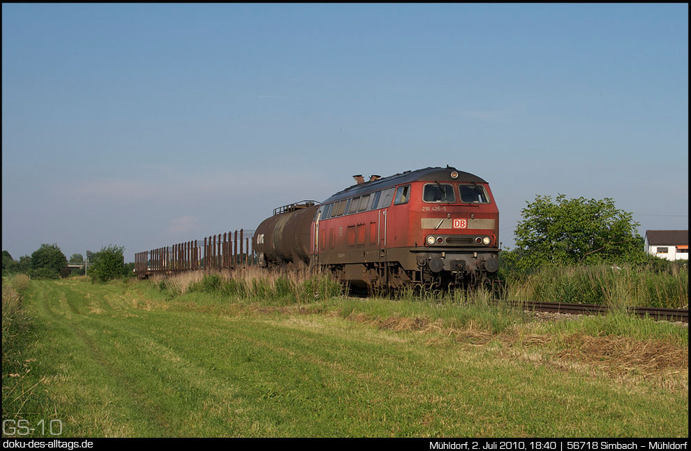 | 4.) Der RE 27001 hatte in Töging Kreuzung mit der Übergabe aus Simbach. Diese wird von 218 426 nach Mühldorf gebracht. Unmittelbar hinter dem Bahndamm fließt nun auf etwa 2 km Länge der Kanal bis Töging parallel. | ||||||