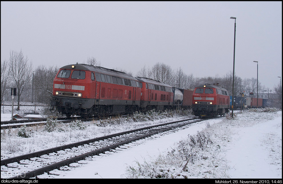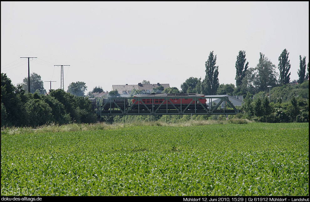 | 8.) Ein Stück weiter zum Bahnhof hin begegneten mir wenige Tage vorher 225 025 und 225 031 mit dem Wackershuttle in der Gegenrichtung. Links im Hintergrund sieht man schon das sich annähernde Gleis aus Simbach, das zusammen mit dem Tüsslinger und dem Landshuter am rechten Bilderand in den Bahnhof Mühldorf mündet. | ||||||