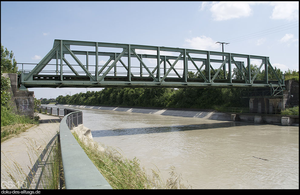 | 1.) Nördlich des Bahnhofs Mühldorf verläuft der Innkanal. Er wird im Abstand von 440 m von zwei Eisenbahnbrücken überspannt. Der von West nach Ost verlaufende Kanal macht bei der hier zu sehenden Brücke der Strecke nach Landshut einen Knick und verläuft bis zur zweiten Brücke im Hintergrund, die zur Simbacher Strecke gehört in südöstlicher Richtung. Dort knickt er wieder nach Osten und verläuft parallel zur Simbacher Strecke. | ||||||
