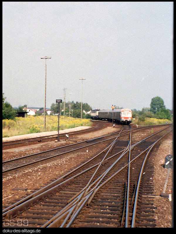 | 10.) Dieses Bild von 1989 ist fast vis à vis zu Bild 8. Es zeigt die Streckentrennungen nach Landshut, von wo der Wendezug gerade kommt, Simbach rechts aus dem Bild laufend und Tüssling rechts ausserhalb vom Bild. Hier liegen auch heutzutage noch mehrere EKW und DKW der Bauart Baeseler. Das ganz linke Gleis ist das Ausziehgleis vom Bw. | ||||||