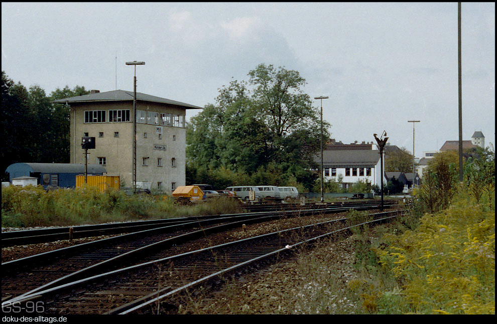 | 13.) Nach der Inbetriebnahme des ESTW wurde das Stellwerk Mf abgerissen. Es stand in dem Bereich im Hintergrund, wo jetzt die Flachbauten des elektronischen Stellwerks stehen. Links im Hintergrund erkennt man wiederum die Kreuzungsweichen der vorherigen Bilder. Eine V60 rangiert ein paar n-Wagen gerade auf dem Simbacher Gleis. | ||||||