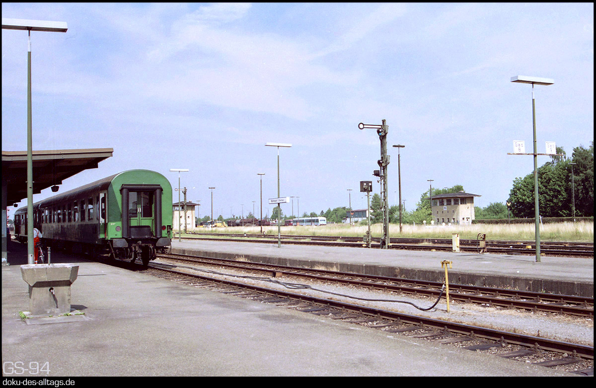 | 1. + 2.) Während auf den Strecken nach Landshut, Rosenheim, Freilassing und Burghausen schon der 628.4 das Regiment übernommen hatte, fuhren auf der Rottalbahn noch 212-bespannte Züge. Für diesen Zweck hatte es sogar einen ex DR-Wagen nach Mühldorf verschlagen. 212 084 wird gerade vor die RB 4205 gesetzt, Abfahrt 10:28. | |||||||