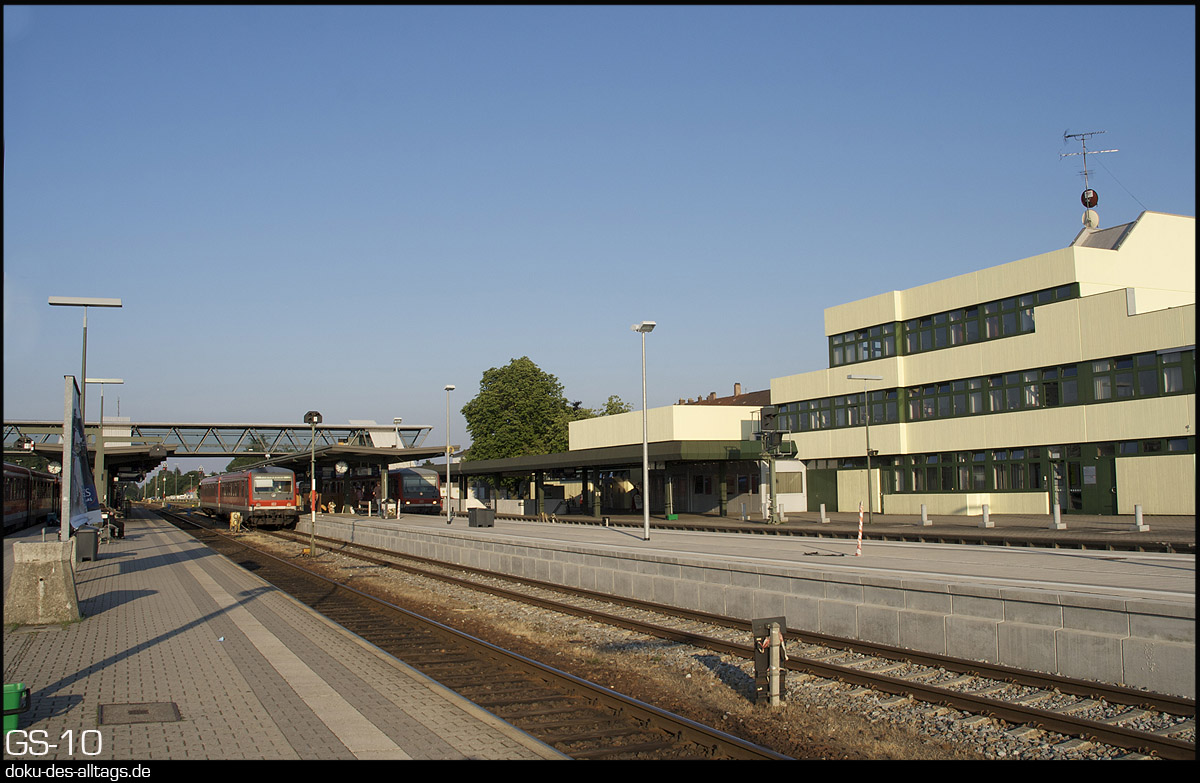 | 7.) Während auf Gleis 5 der doppelte 628 nach Simbach und Burghausen einfährt, drückt die V60 ihre Wagen ans westliche Bahnsteigende. | |||||||