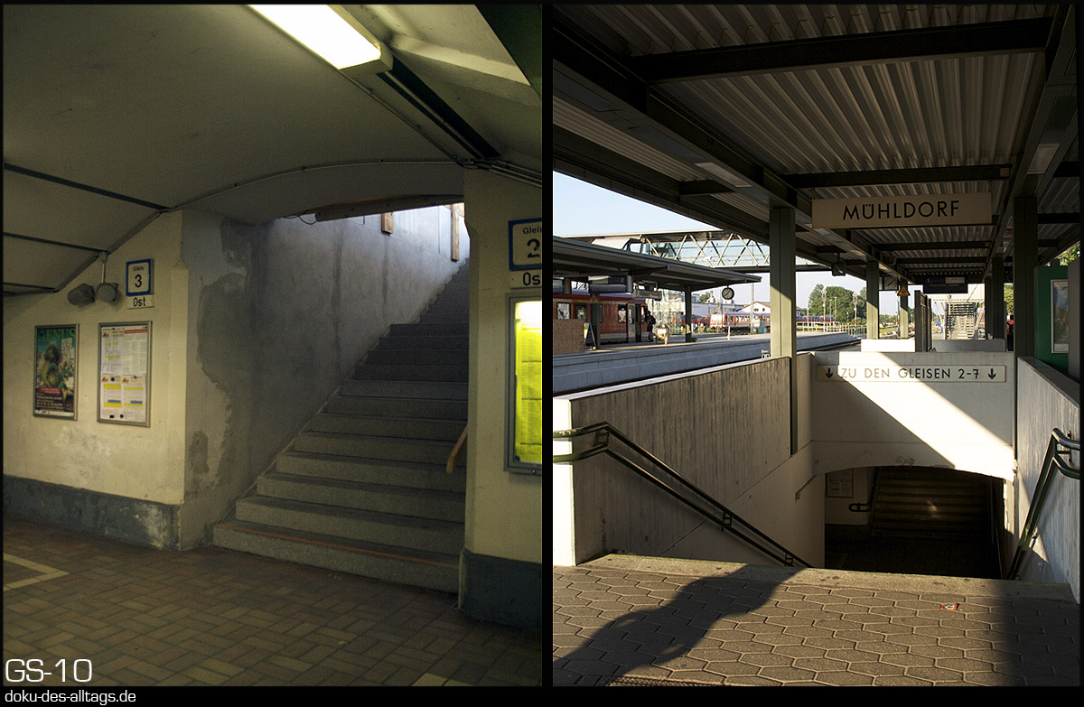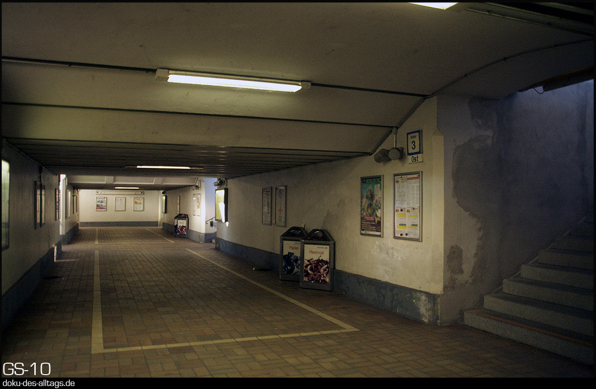 | 12.) Impressionen der Bahnsteigunterführung. Am Hausbahnsteig war da noch die Beschilderung aus Bundesbahnzeiten. | |||||||