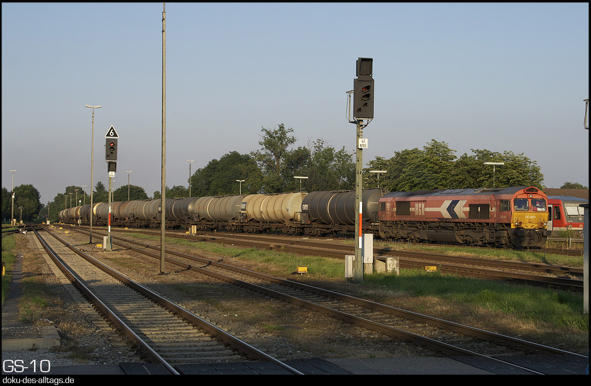 | 18.) Noch bevor die Class 77 den Güterverkehr vereinnahmte, war desöfteren die DE 669 der HGK zwischen Burghausen und Mühldorf zu sehen. Hier poltert sie mit einem Kesselwagenzug durch den Personenbahnhof. | |||||||