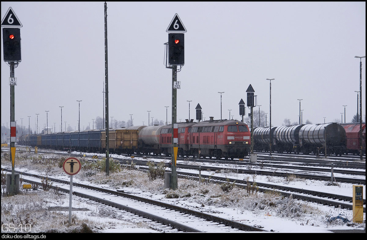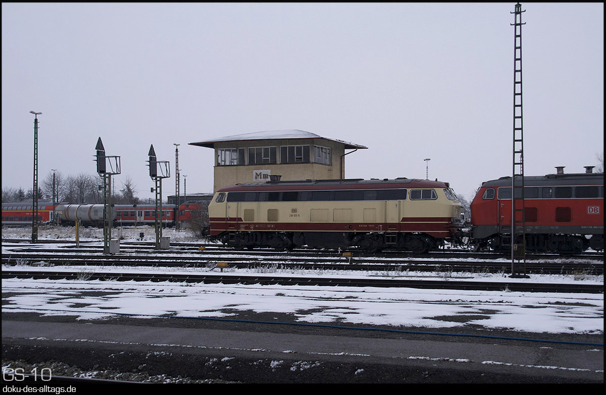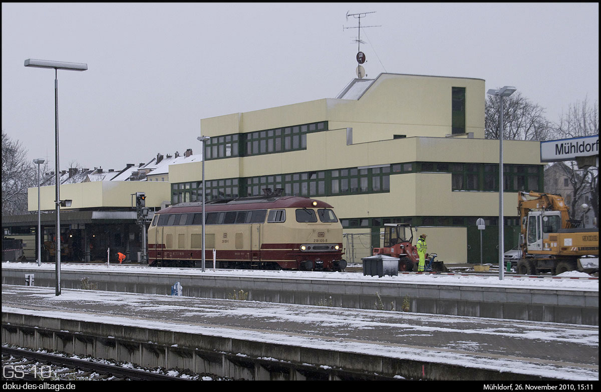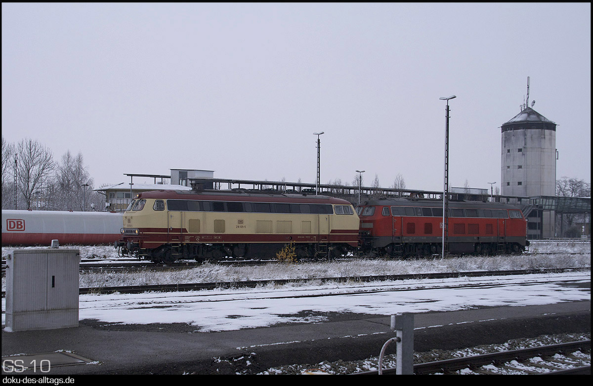 | 1.) Am 26.11.2010 ist die Aschaffenburger 218 105 (DB Regio WestFrankenBahn) in Mühldorf zu Gast. Sie wird später einen Sonderzug von Altötting nach Nürnberg befördern. 218 105 ist seit ihrer Umlackierung am 26.04.2010 zusammen mit 217 002 die dritte Lok der V160 Familie im IC-Anstrich, der ursprünglich nur der Farbmusterlok 218 217 vorbehalten war. Hier steht sie gegen halb 12 Uhr vormittags im Schneegeriesle im Bw. | |||