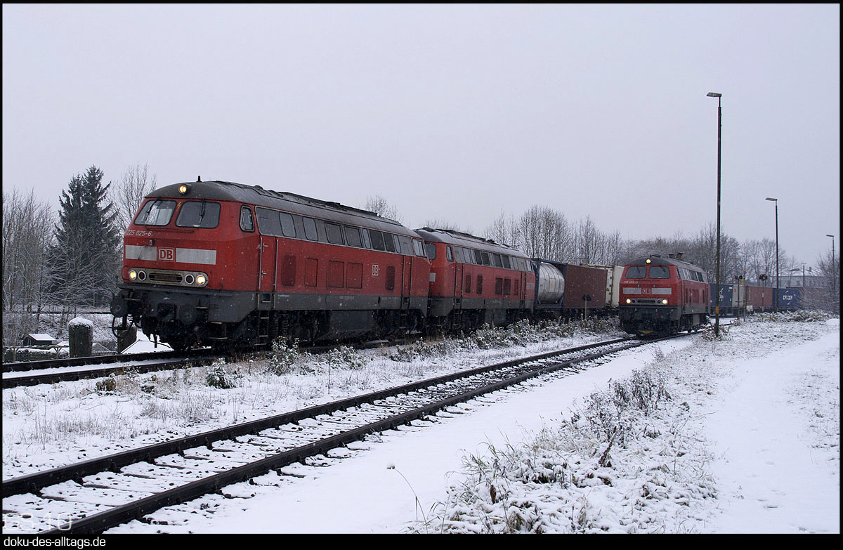 | 3.) Nach einem Abstecher nach Tüßling kam ich am frühen Nachmittag nach Mühldorf zurück. Der Nebel hatte sich etwas verzogen, aber es schneite immer noch, als 225 025 und 225 031 sich auf dem Weg nach Landshut machten (siehe auch Seite 8, Bild 8). Auf dem Ausziehgleis steht 218 465 und wartet auf die Ankunft von 218 105, die inzwischen den Sonderzug aus Altötting holte. | |||