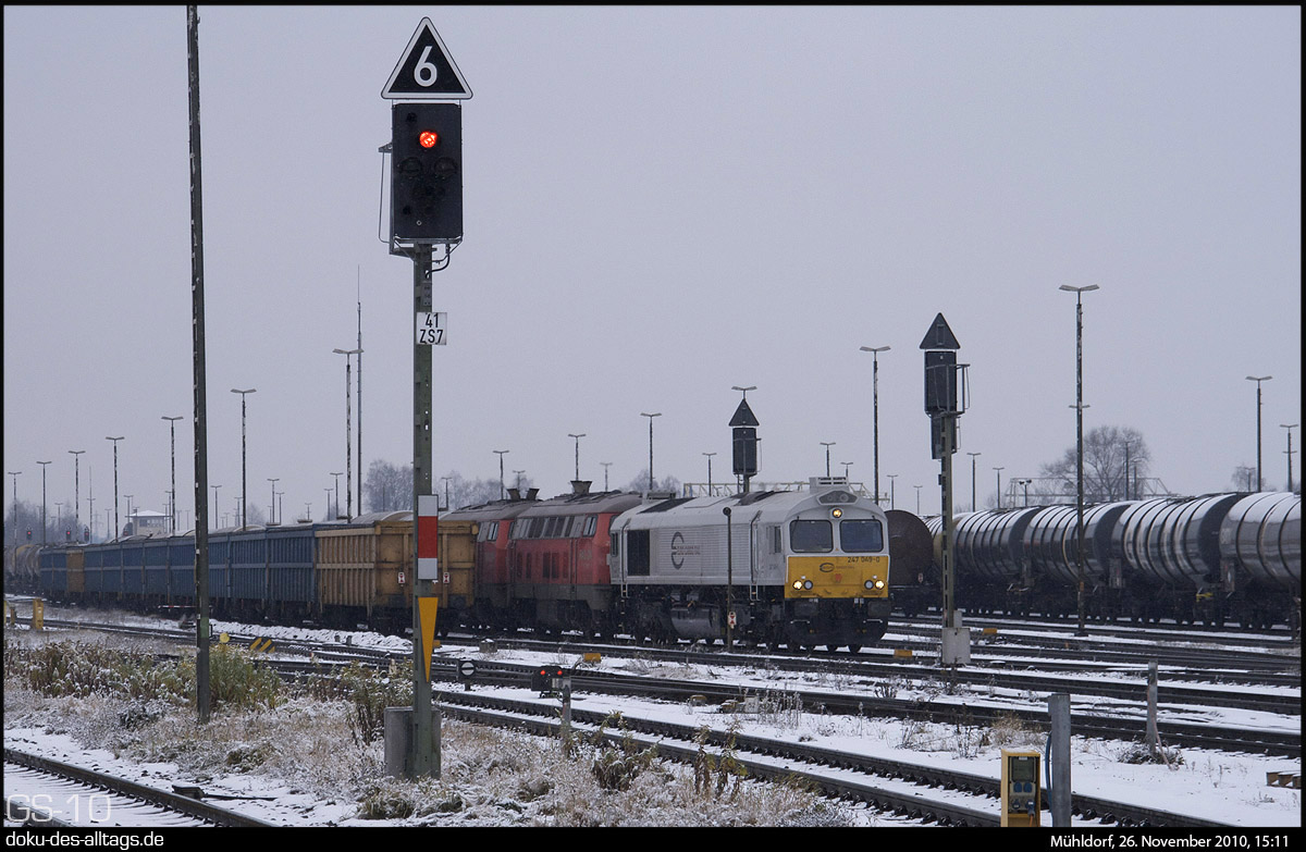 | 4.) Der 225er Doppeltraktion wird nun noch 247 049 vorgespannt. Dazu musste der ganze Güterzug noch ein Stück zurückgesetzt werden. Die Zeit des Übergangs war nur kurz, dass man V160 und Class 77 im Mischverkehr beobachten konnte. | |||