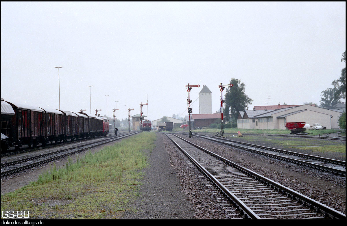 Links wartet 218 311 mit einem langen Güterzug auf die Ausfahrt. 218 311 war zu dem Zeitpunkt die erste und noch einzige orientrote 218 beim Bw Mühldorf. Sie wechselte bereits im März 1988 ihre purpurrote Farbgebung gegen die orientrote.