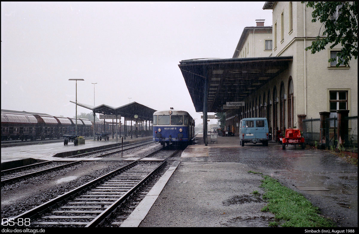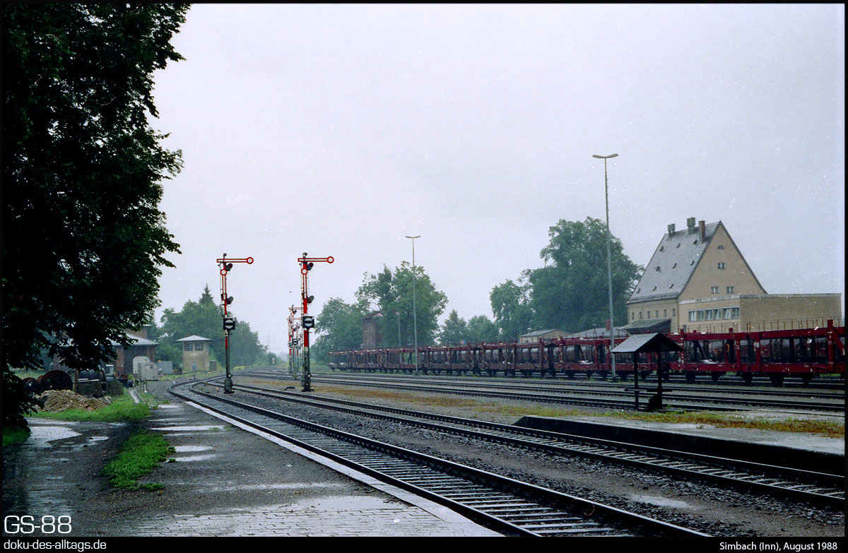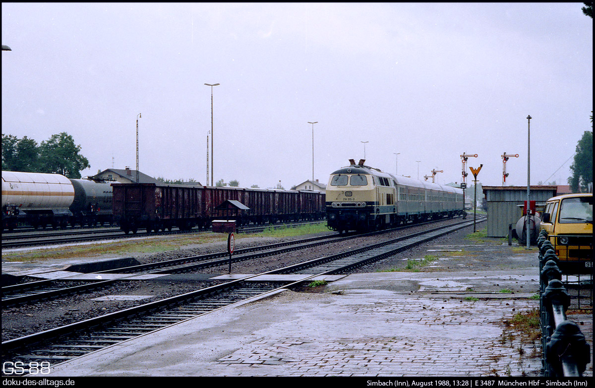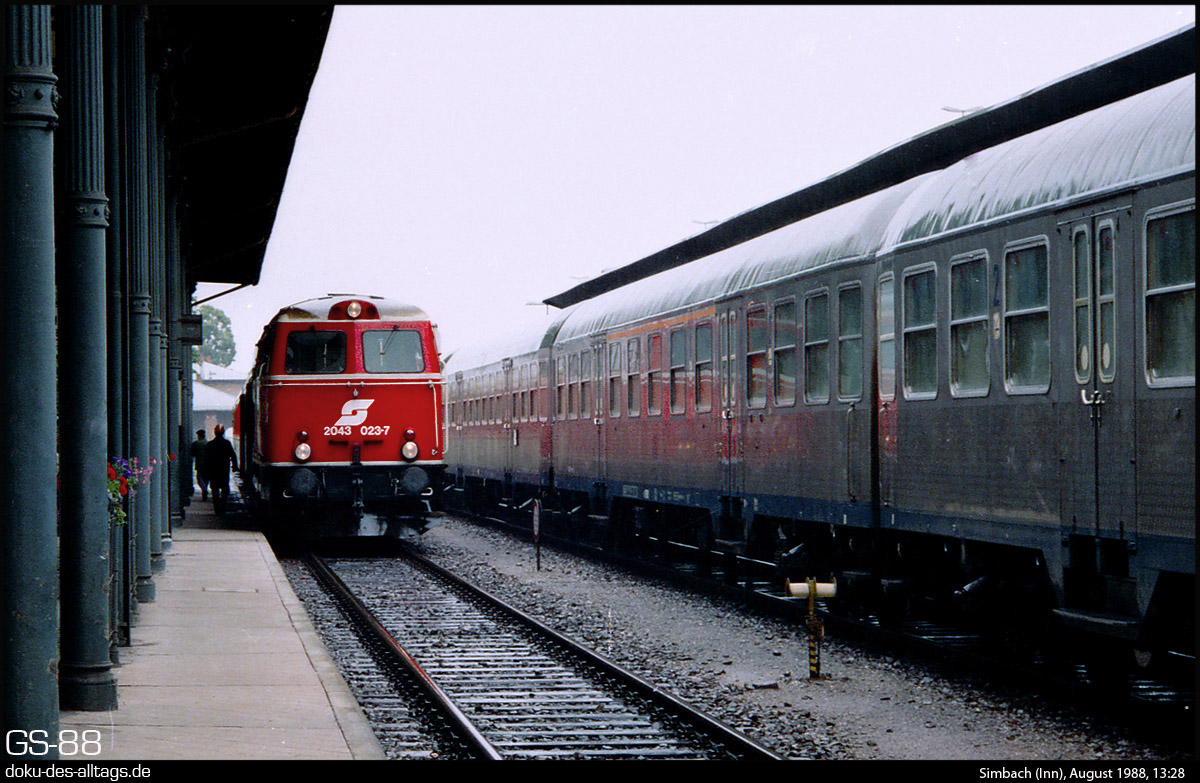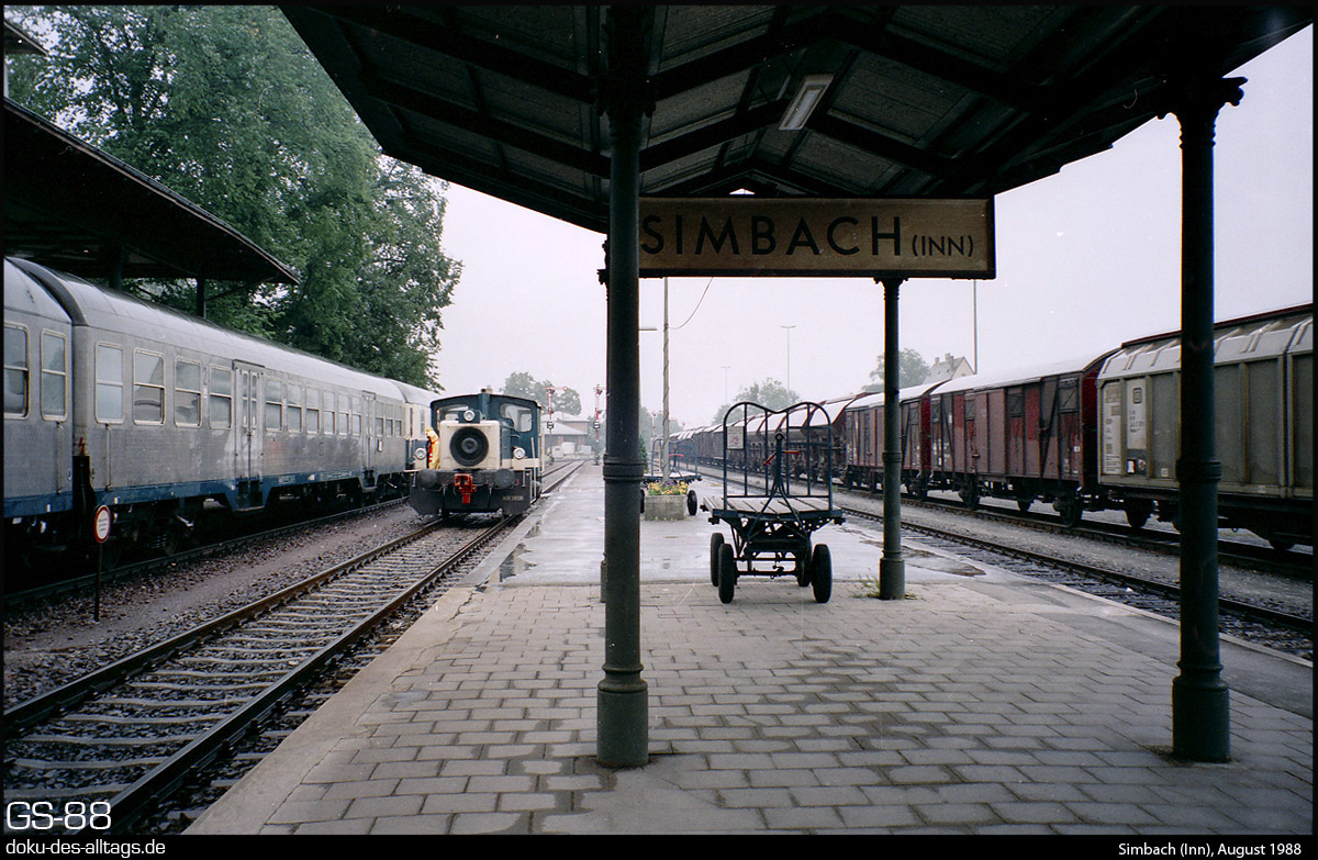 Bei km 113,8 wird der Grenzbahnhof Simbach (Inn) erreicht. Bis zur Überquerung des Inns und somit zur österreichischen Grenze sind es noch 1,3 km. Der größte Teil der DB-Züge enden in Simbach, grenzüberschreitenden Durchgangsverkehr gibt es in den 80er Jahren nur in Form von Kurswagen. Anschluß nach Österreich bieten ÖBB-Züge, die entweder mit 2043 bespannt sind oder Schienenbusse der Reihe 5081.