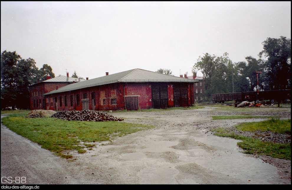 Rechts im Bereich der Lagerhallen befand sich früher das Bw Simbach mit einem 19-ständigen Ringlokschuppen, sowie einer rechteckigen Werkstatthalle mit drei Ständen.