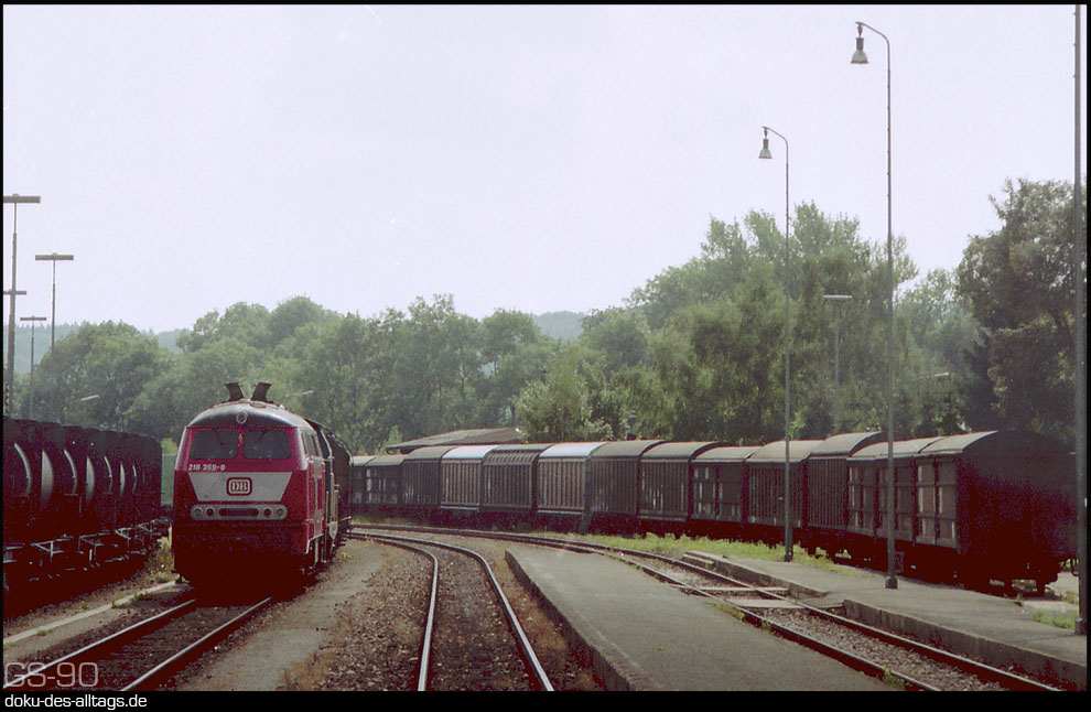 | 3.) Halt am Bahnsteig von Gleis 3. In Blickrichtung setzen sich, aus dem Gegenlicht rollend, 218 359 und 212 209 langsam in Bewegung. Sie haben auf dem zum Stumpfgleis zurückgebauten Gleis 4 einen Güterzug nach Mühldorf geholt. | |||||||