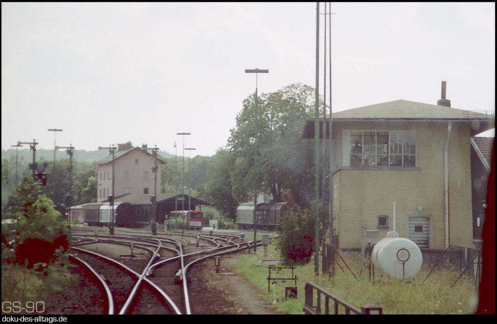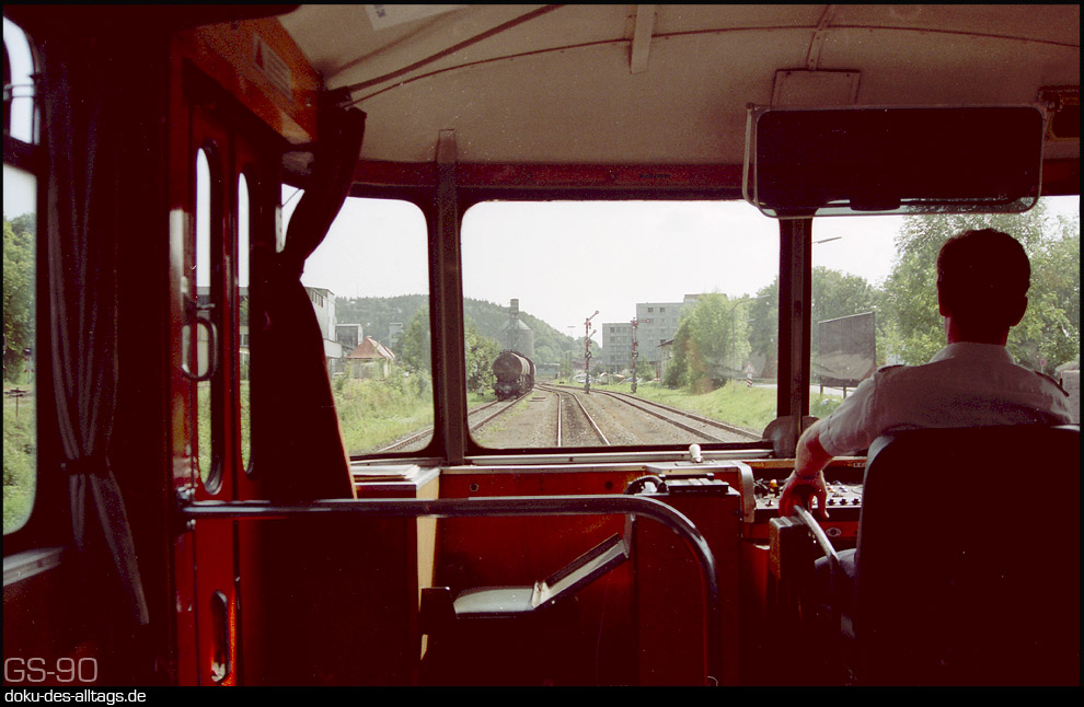 | 5.) So macht das Bahnfahren Spaß. Das ratschende Geräusch des Schalthebels hat man förmlich im Ohr. Der Nto 5481 hat planmäßig 6 Minuten Aufenthalt in Trostberg und brummt pünktlich um 13.01 Uhr mit Hp 2 wieder los. Im Hintergrund die Werksanlagen der SKW Trostberg. Links das Stumpfgleis 4, von dem die 218 und die 212 ihren Güterzug geholt haben. | |||||||