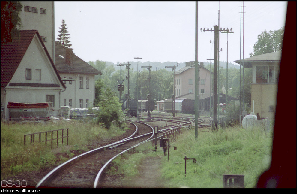 | 1. + 2.) Einfahrt in den Bahnhof Trostberg. Wegen der Kurvenlage sind dort einige Bogenweichen notwendig. Vorbei geht es am Stellwerk To (mech. E). Links befindet sich das BayWa-Lagerhaus. Interessant ist auch das Anschlußgleis, das wegen der engen Radien nicht vom äußersten Bahnhofsgleis, sondern vom nächsten abzweigt und über eine Kreuzung das äußerste quert. | |||||||