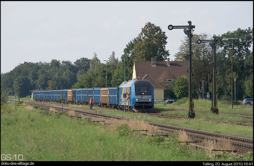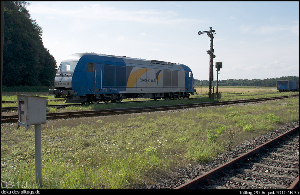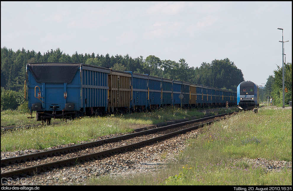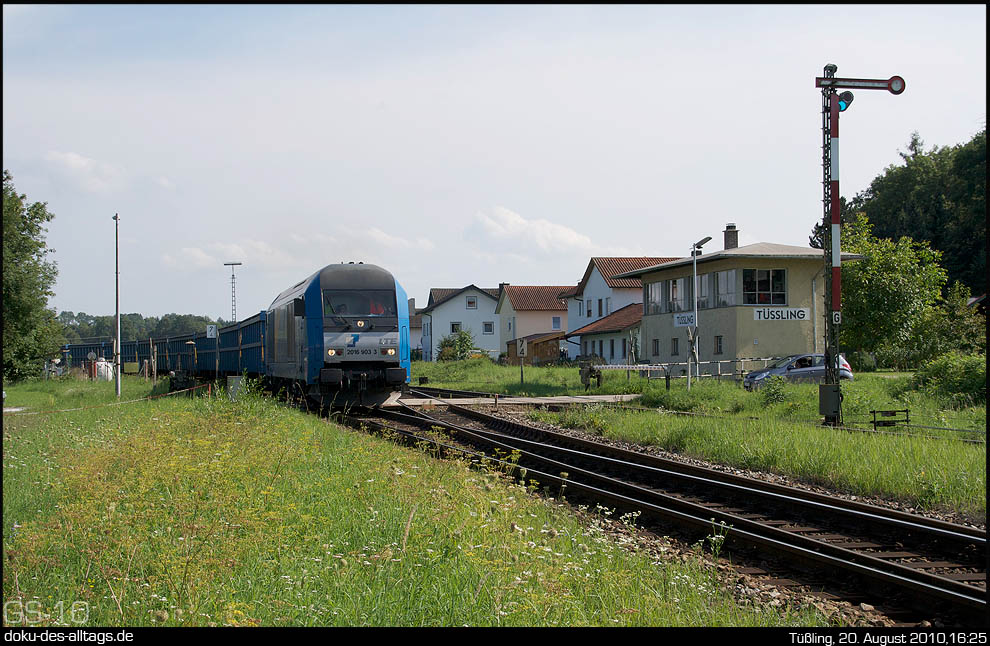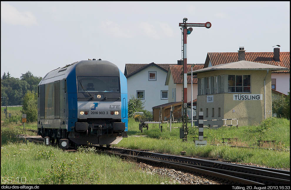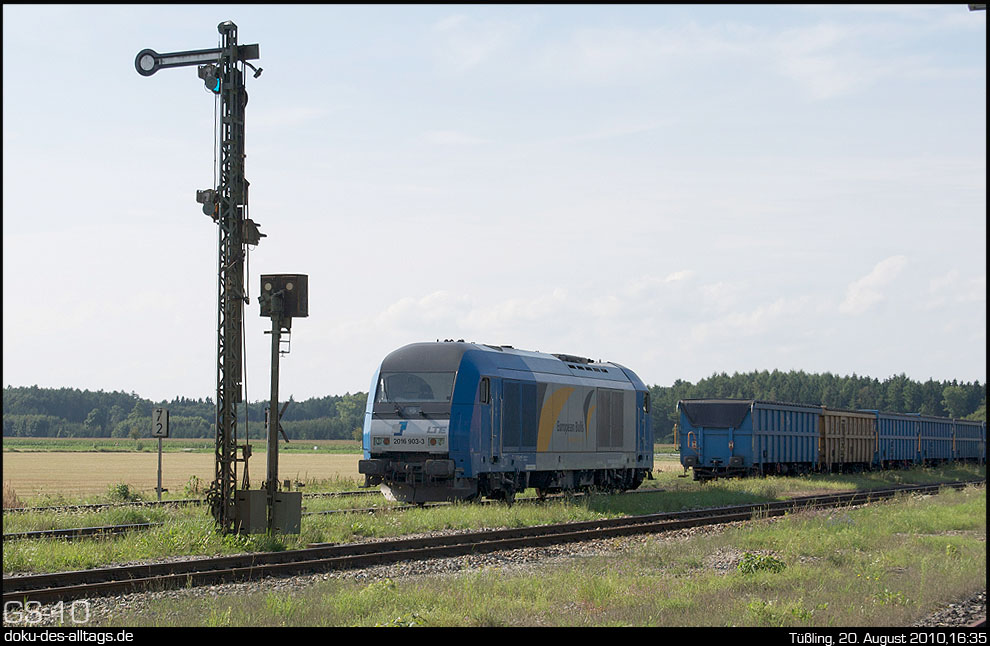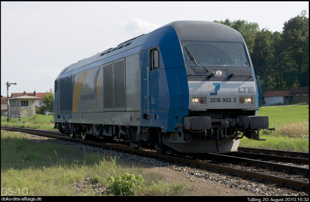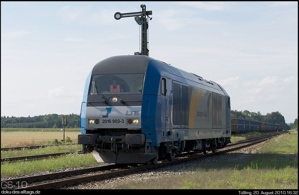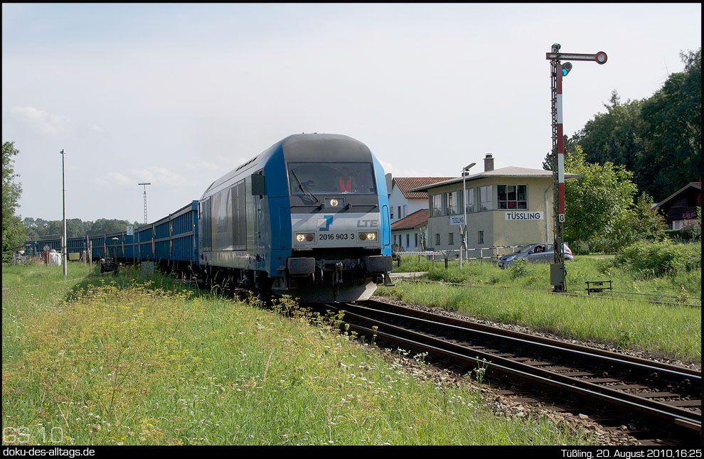 | 1.) Um 16:25 kommt von Burghausen die Hercules 2016 903 der österreichischen Bahngesellschaft LTE (Logistik- und Transport-GmbH) mit einem langen Kokszug von den Wackerwerken in Burghausen nach Salzburg. Deshalb muß in Tüßling Kopf gemacht werden. | |||||||||||||