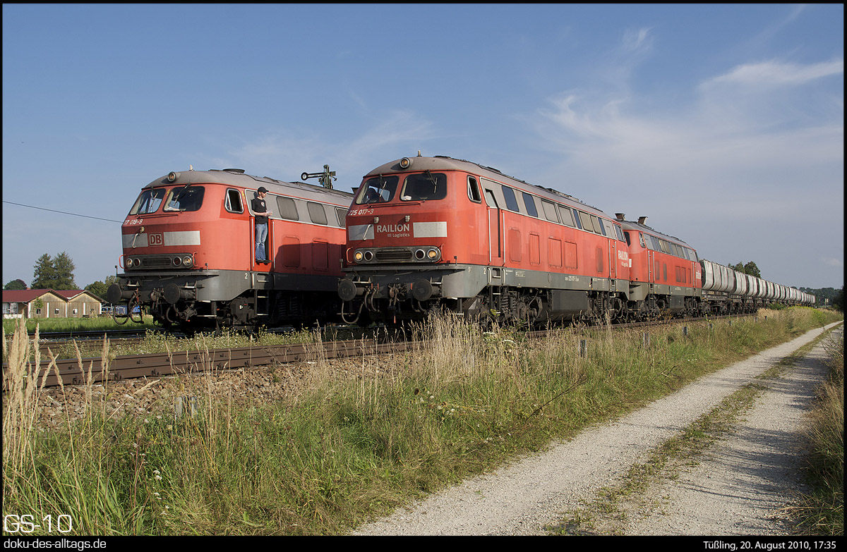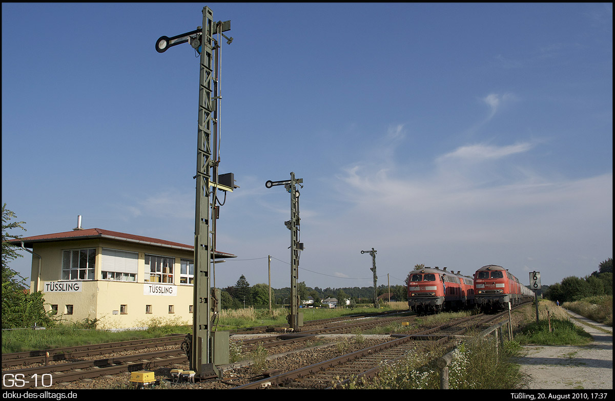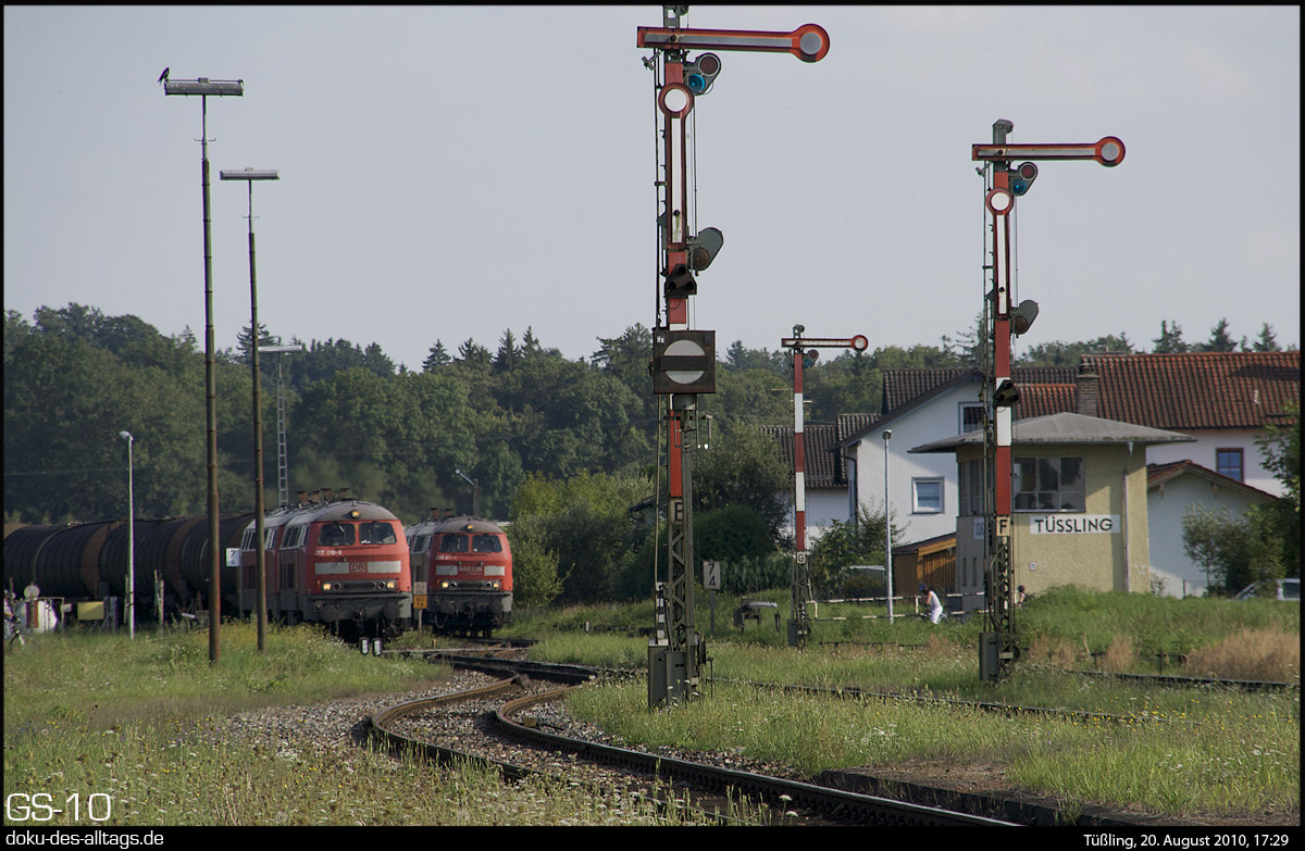 | 18. + 19.) Im 3-Minutenabstand verlassen dann auch die beiden 217er den Bahnhof. Die beiden Ausfahrten im 3-Minutenabstand wären so früher nicht möglich gewesen, da zwischen Tüßling (km 7,0) und Mühldorf (km 0,0) nur die heute nicht mehr existente Deckungsstelle Mühldorf-Ehring (km 3,7) lag. Damit der zunehmende Güterverkehr besser durchgeschleust werden kann, wurden in dieser Fahrtrichtung zwei Blocksignale neu eingebaut, eins in km 5,0, das zweite in km 2,3. Das Esig Mühldorf ist in km 0,8. Damit wurden engere Folgestellen erreicht. | ||||||||||||||