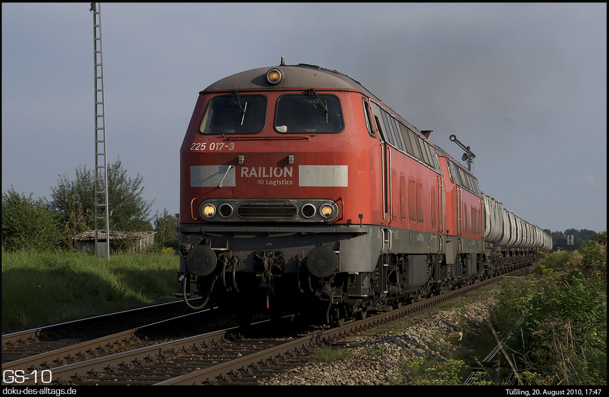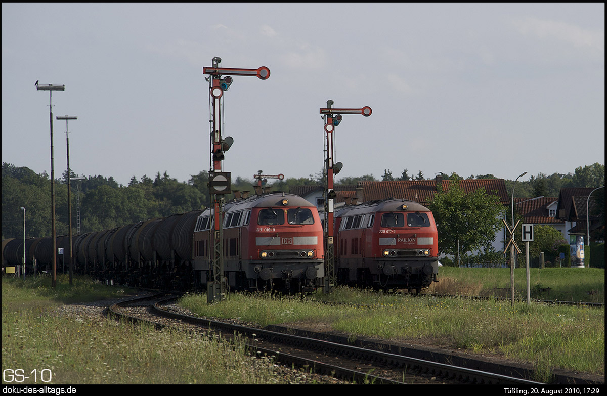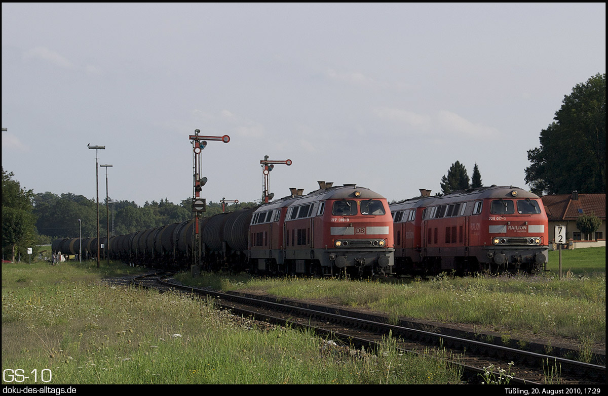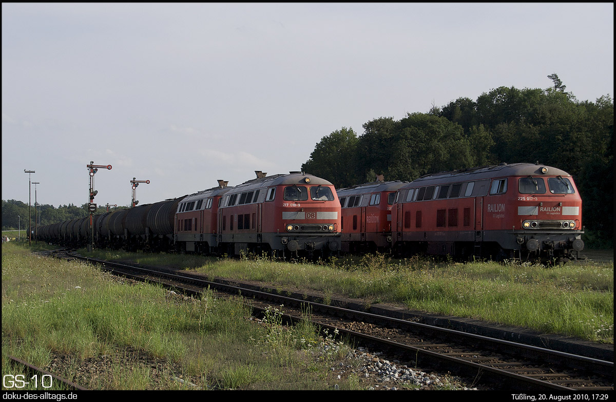 | 2.) Erneutes Wiedersehen mit 217 019 und 217 012 (links), sowie 225 017 und 225 030 (rechts). Letzere beiden fuhren eine halbe Stunde zuvor als Lz nach Garching (Sequenz 6), die beiden ersteren waren in dem Fünfergespann vor 1,5 Stunden nach Burghausen unterwegs (Sequenz 3). | ||||||||||||||