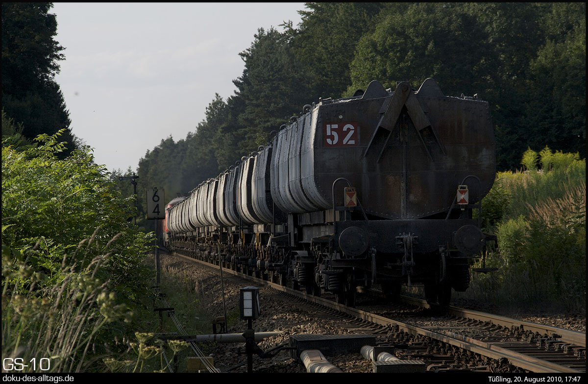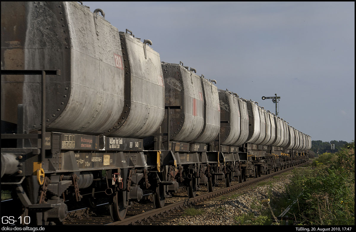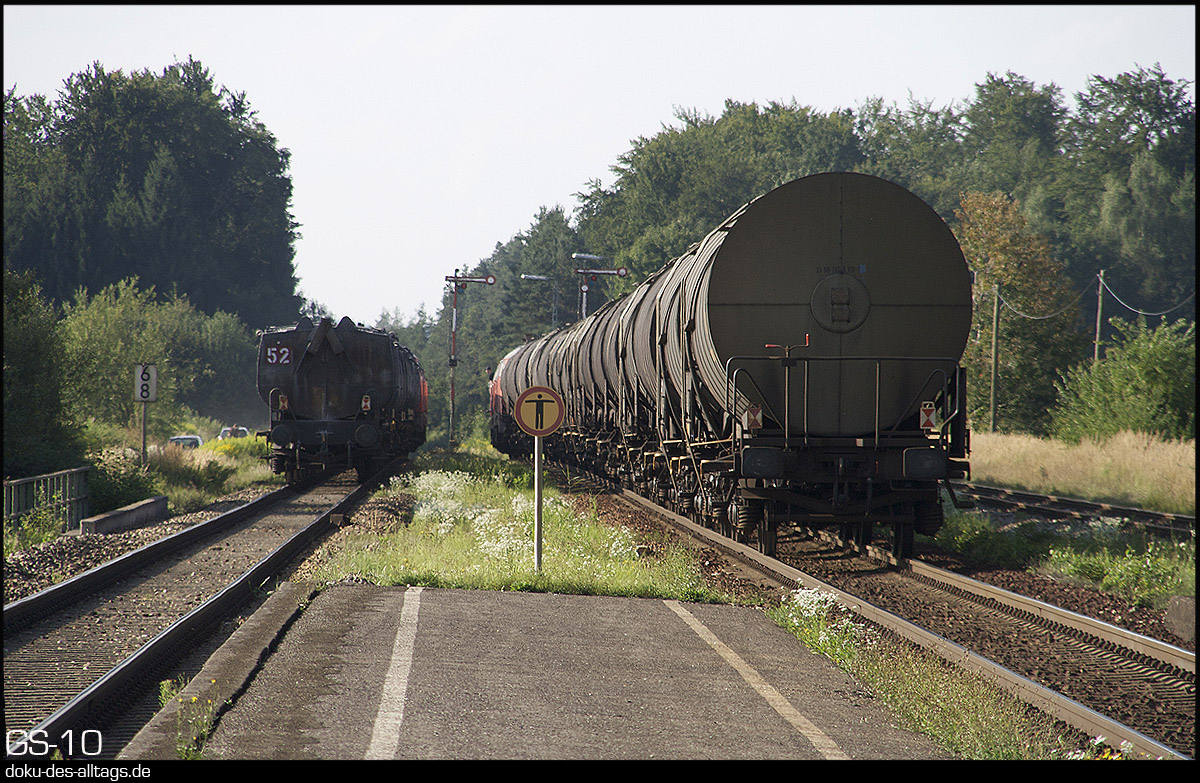 | 3.) Auf Höhe der Ausfahrtsignale wird ein Kopf-an-Kopf-Rennen ausgetragen. Das linke Gespann führt einen Kesselwagenganzzug aus Burghausen mit sich, das rechte Kalkkübelwagen aus Garching oder Trostberg. | ||||||||||||||